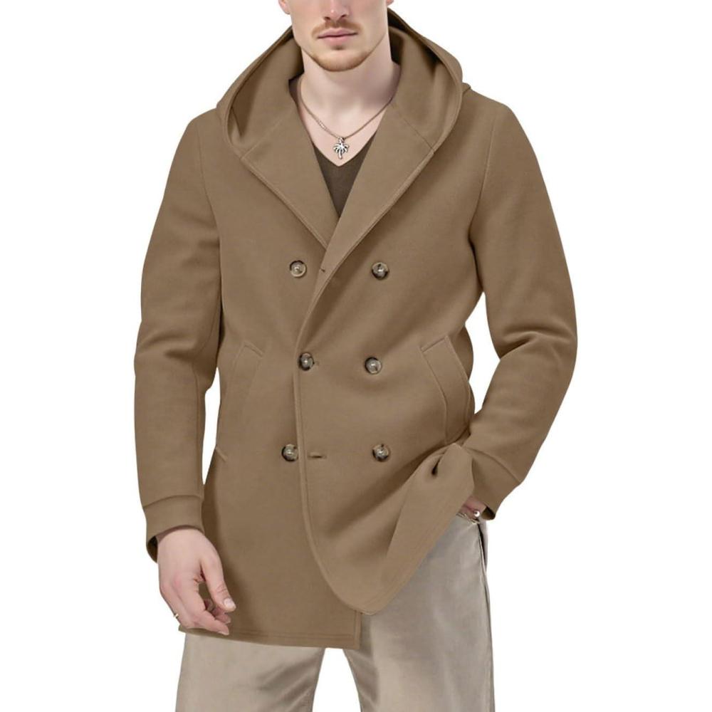 chouyatou Men’s Hooded Wool Coat Double Breasted Trench Pea Coat Wool Blend Jacket with Pockets(Khaki)