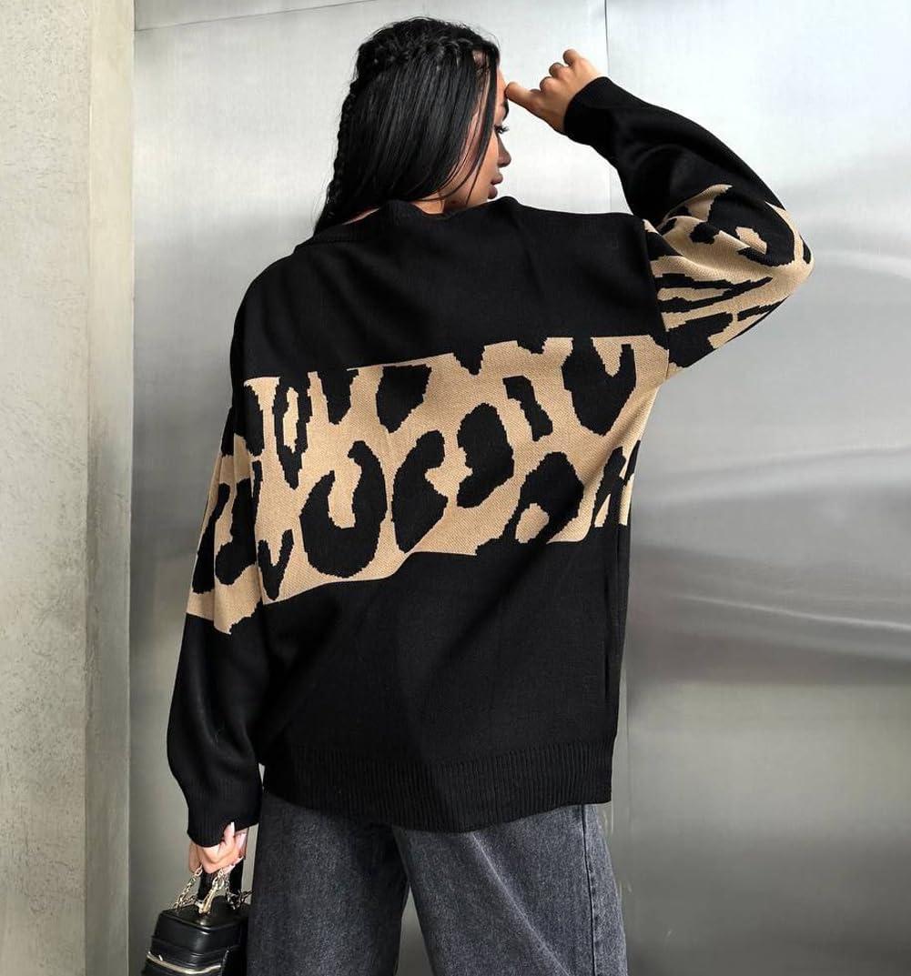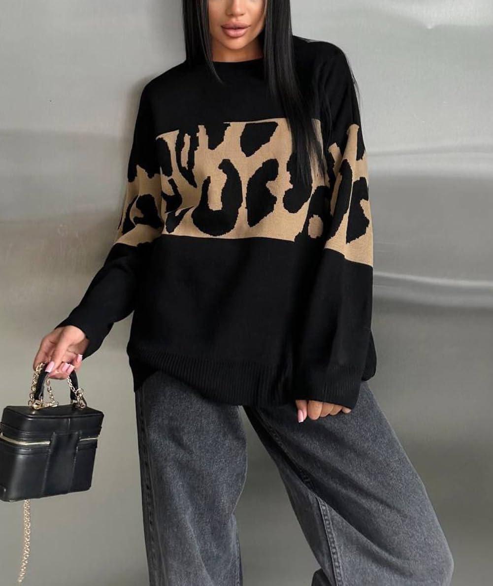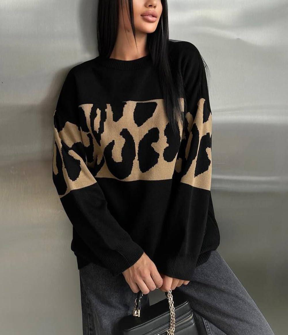 imagechouyatou Women 2025 Fall Leopard Print Pullover Sweater Crewneck Oversized Color Block Sweater Jumper TopBlack
