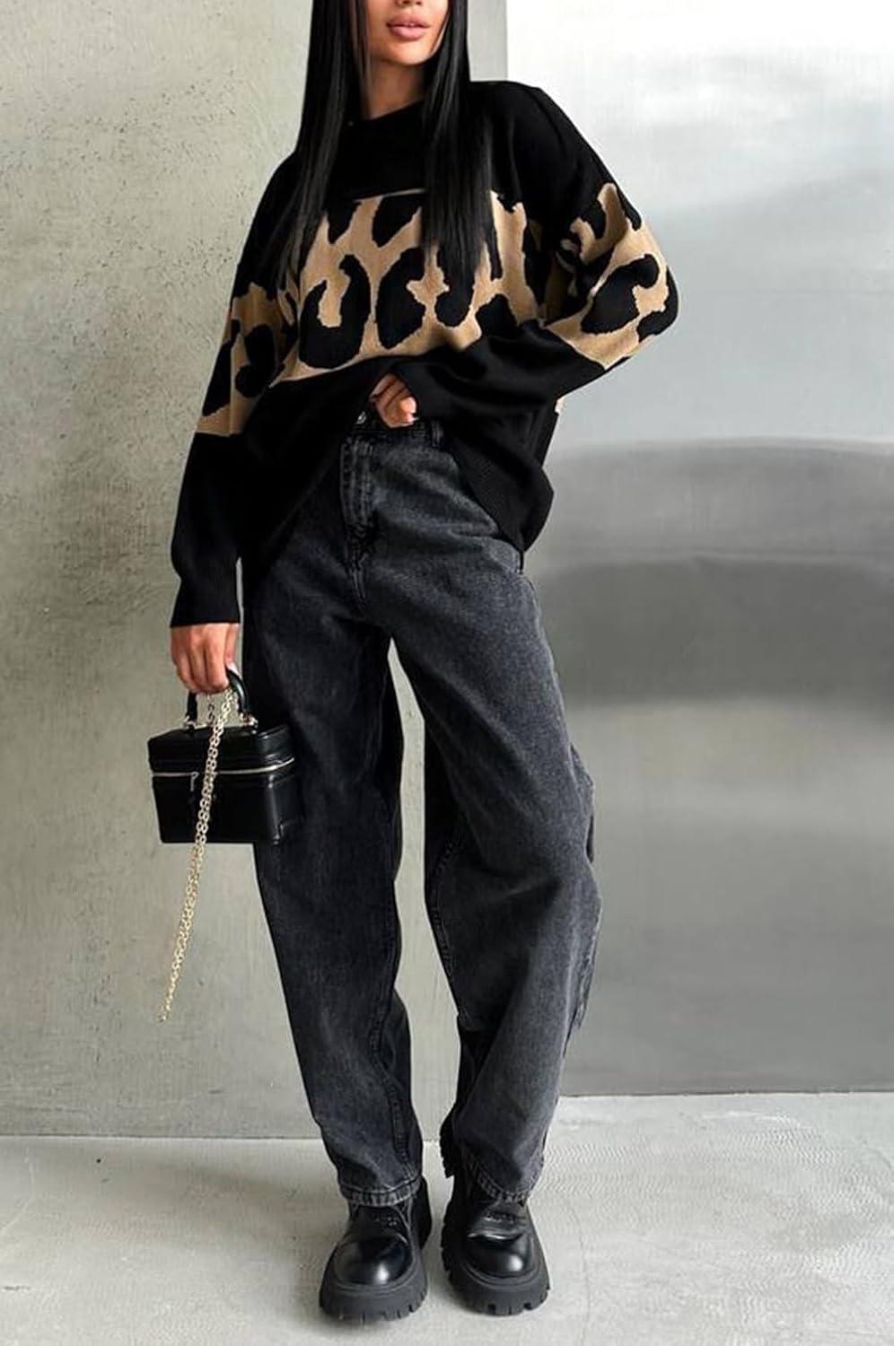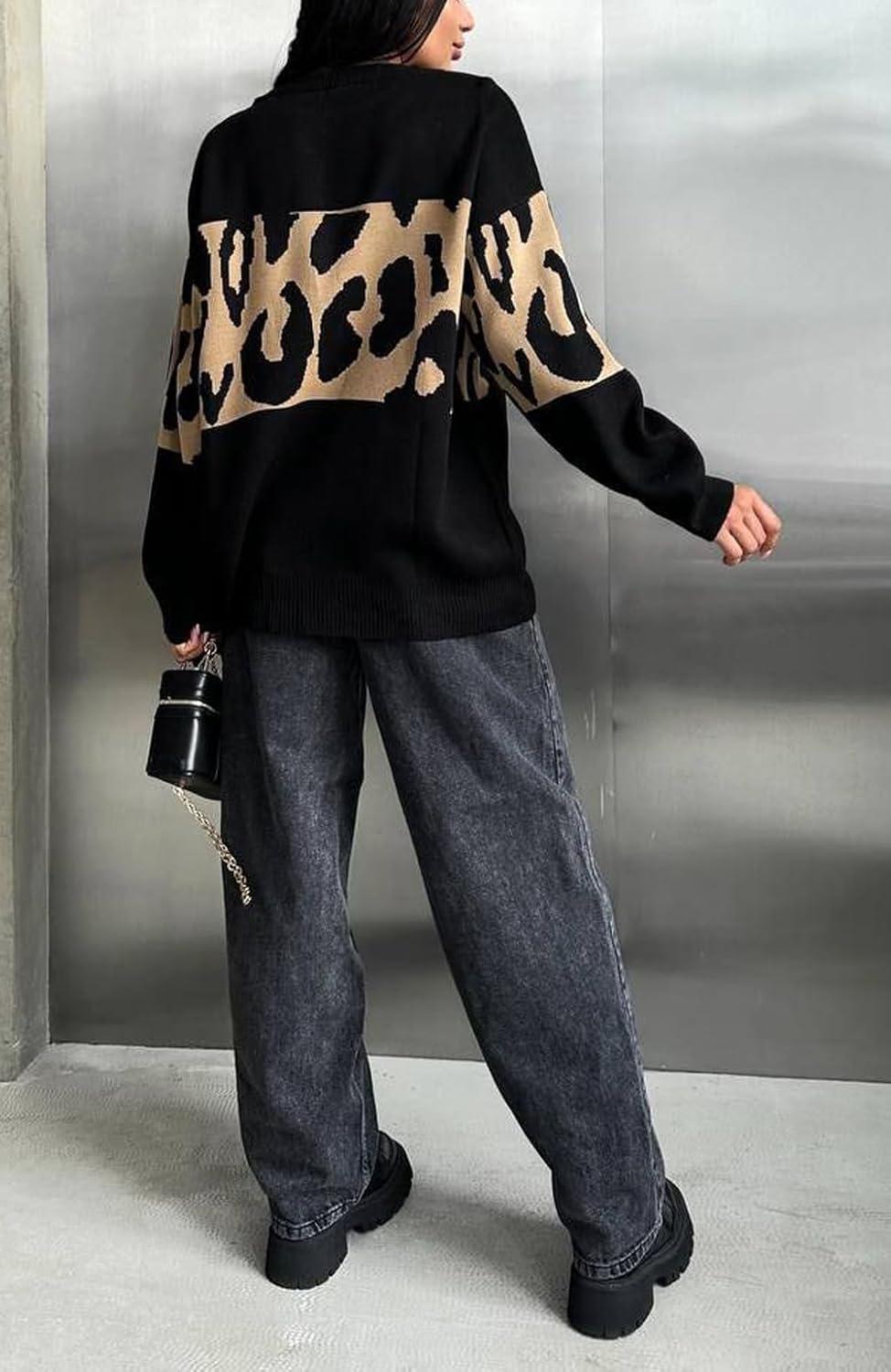 chouyatou Women 2025 Fall Leopard Print Pullover Sweater Crewneck Oversized Color Block Sweater Jumper Top(Black)