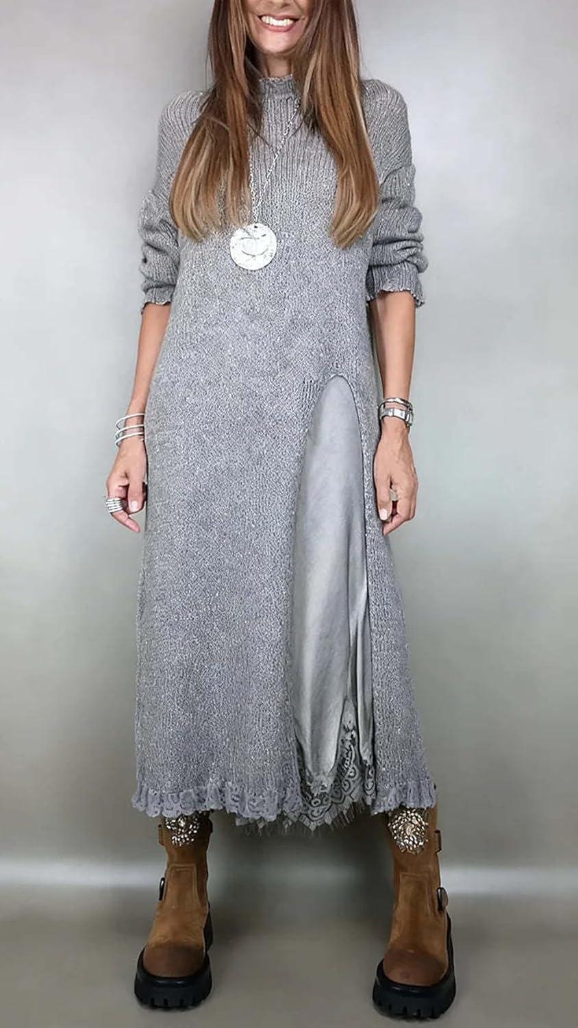 chouyatou Women 2025 Fall Twofer Sweater Dress with Lace Trim Slip Dress 2 Piece Sweater Sets Winter Outfits(Grey)