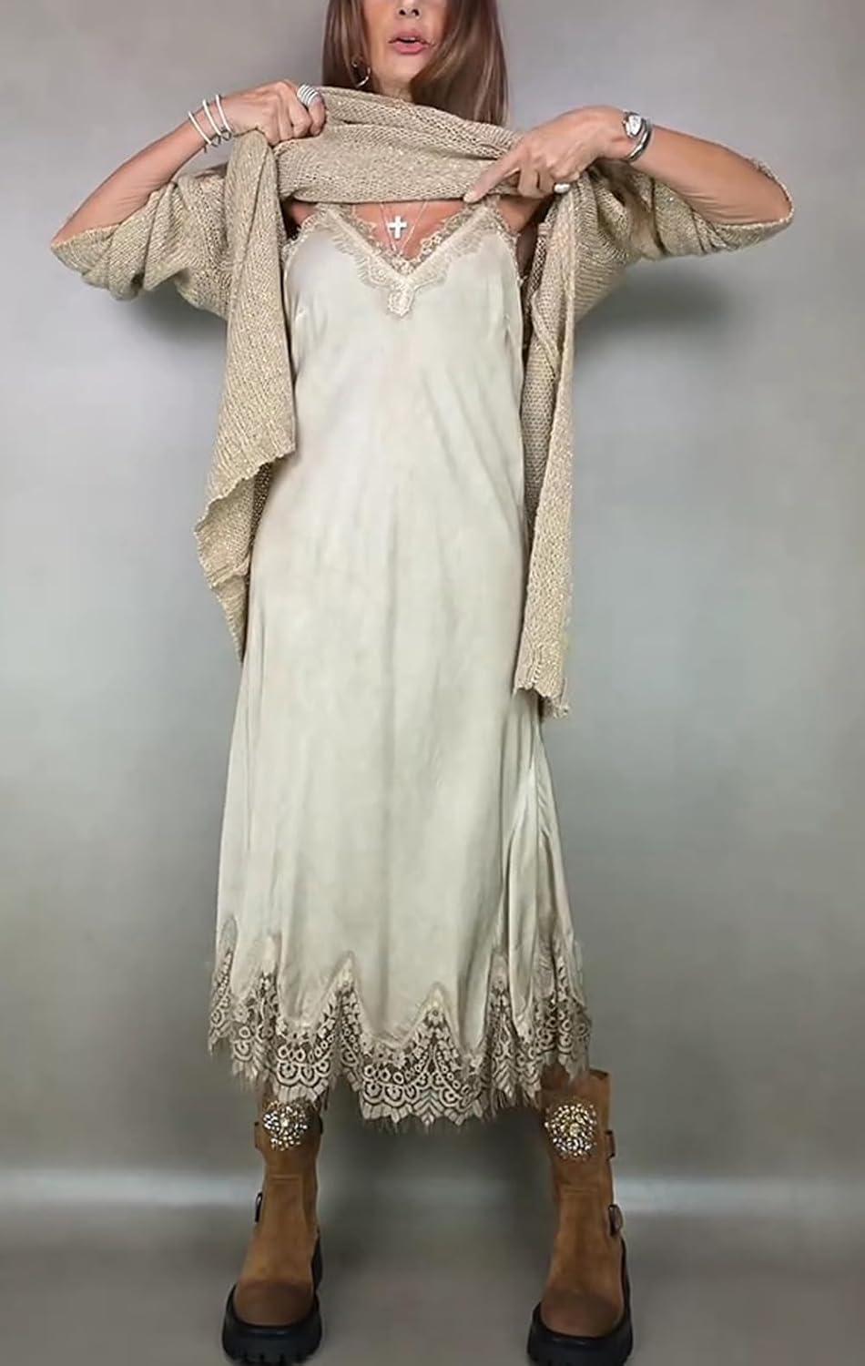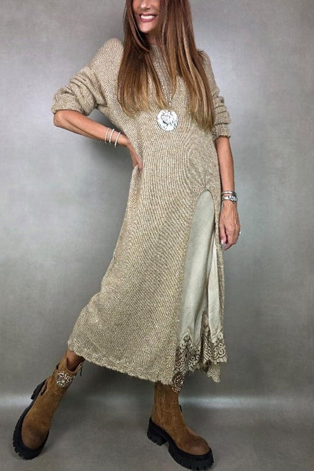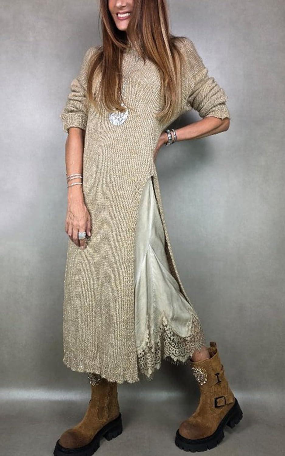 chouyatou Women 2025 Fall Twofer Sweater Dress with Lace Trim Slip Dress 2 Piece Sweater Sets Winter Outfits(Khaki)