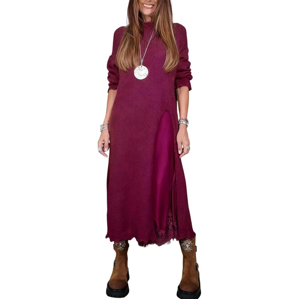 imagechouyatou Women 2025 Fall Twofer Sweater Dress with Lace Trim Slip Dress 2 Piece Sweater Sets Winter OutfitsRed