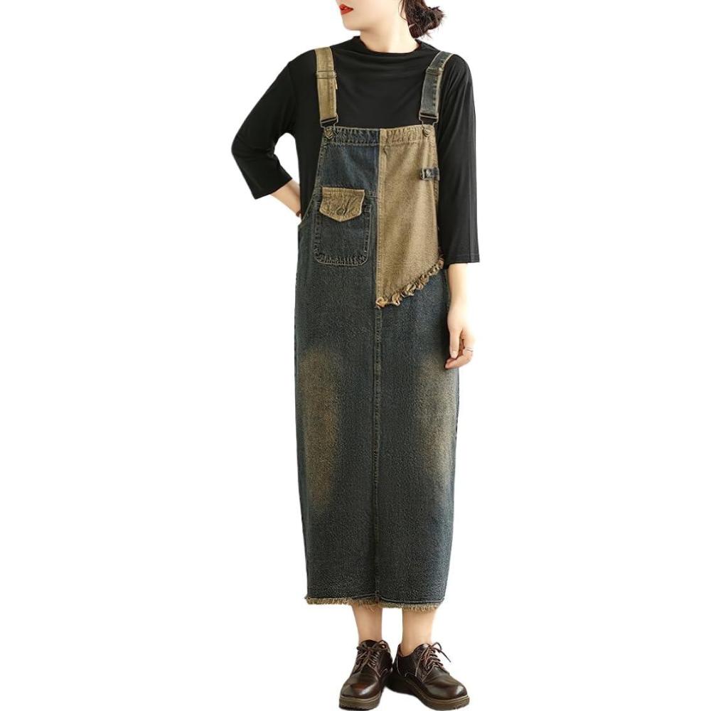 chouyatou Women Baggy Adjustable Strap Distressed Denim Overall Dress Splicing Pinafore Jean Tank Dress(Brown)