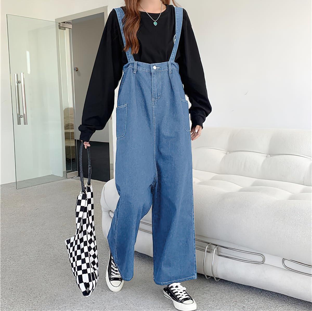 chouyatou Women Denim Bib Overalls Adjustable Strap Wide Leg Jean Jumpsuits Loose Fit Romper with Pockets(Retro Blue)