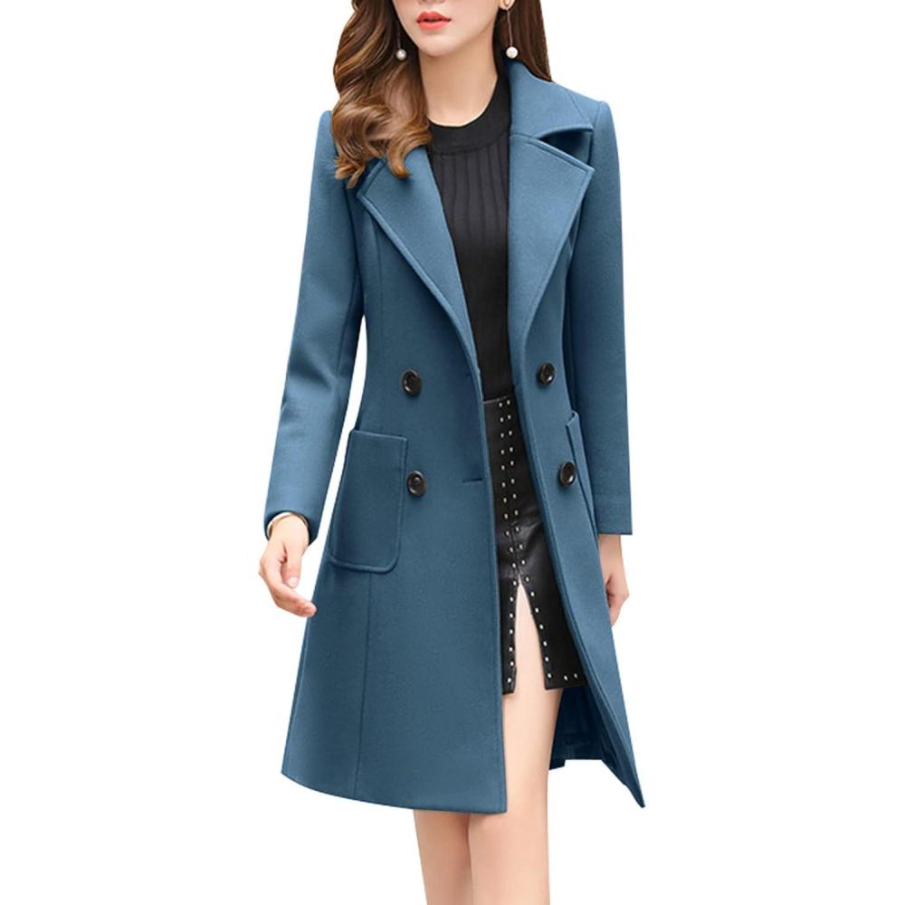 chouyatou Women Elegant Notched Collar Double Breasted Wool Blend Over Coat(Dark Blue)