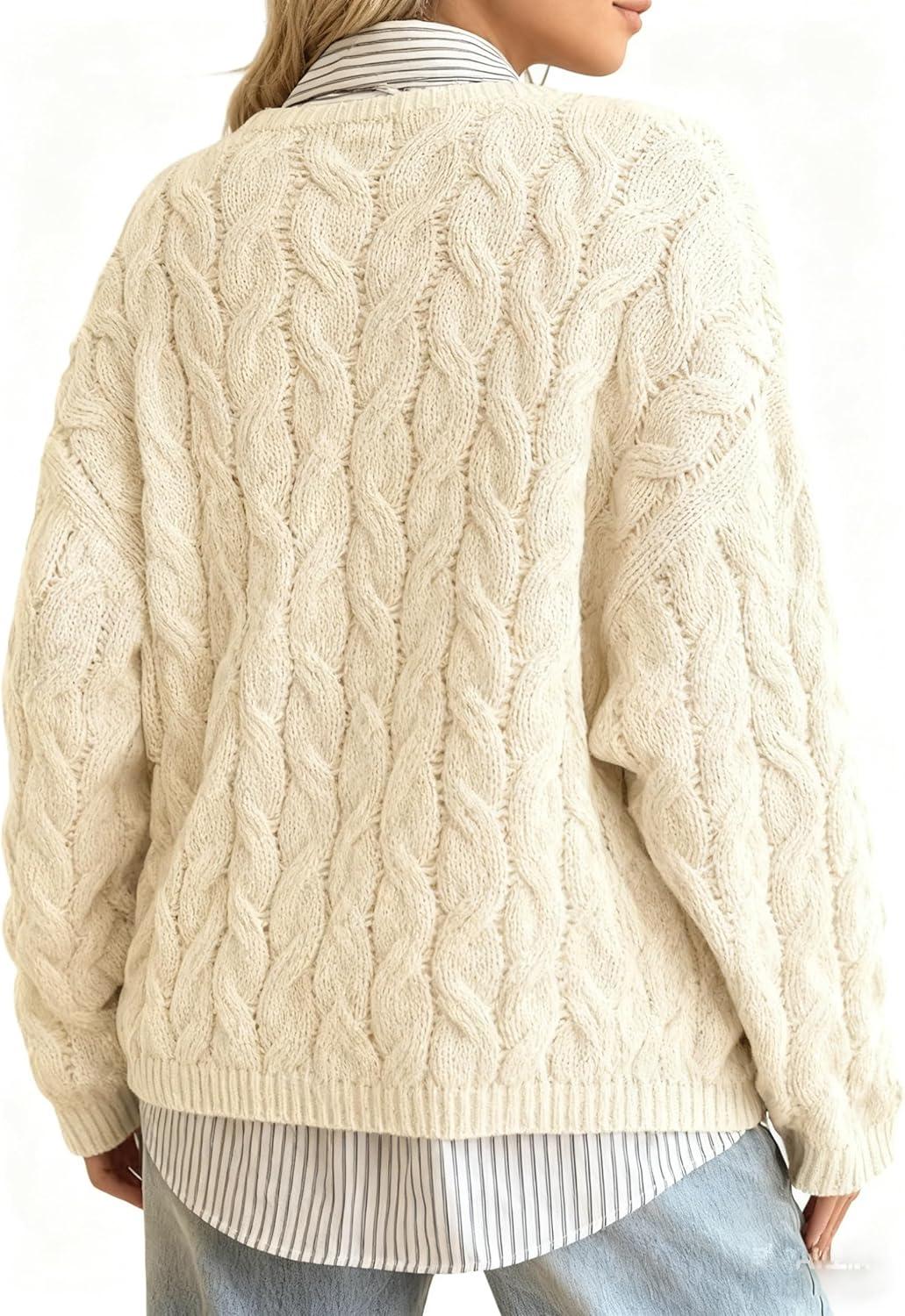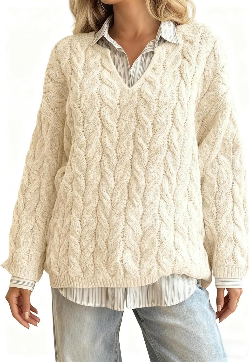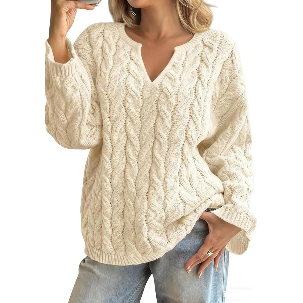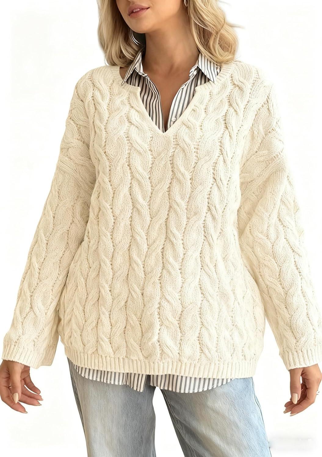 chouyatou Women Fall Notch V-Neck Cable Knit Pullover Sweater Loose Winter Chunky Cozy Sweater Jumper Top(Beige)