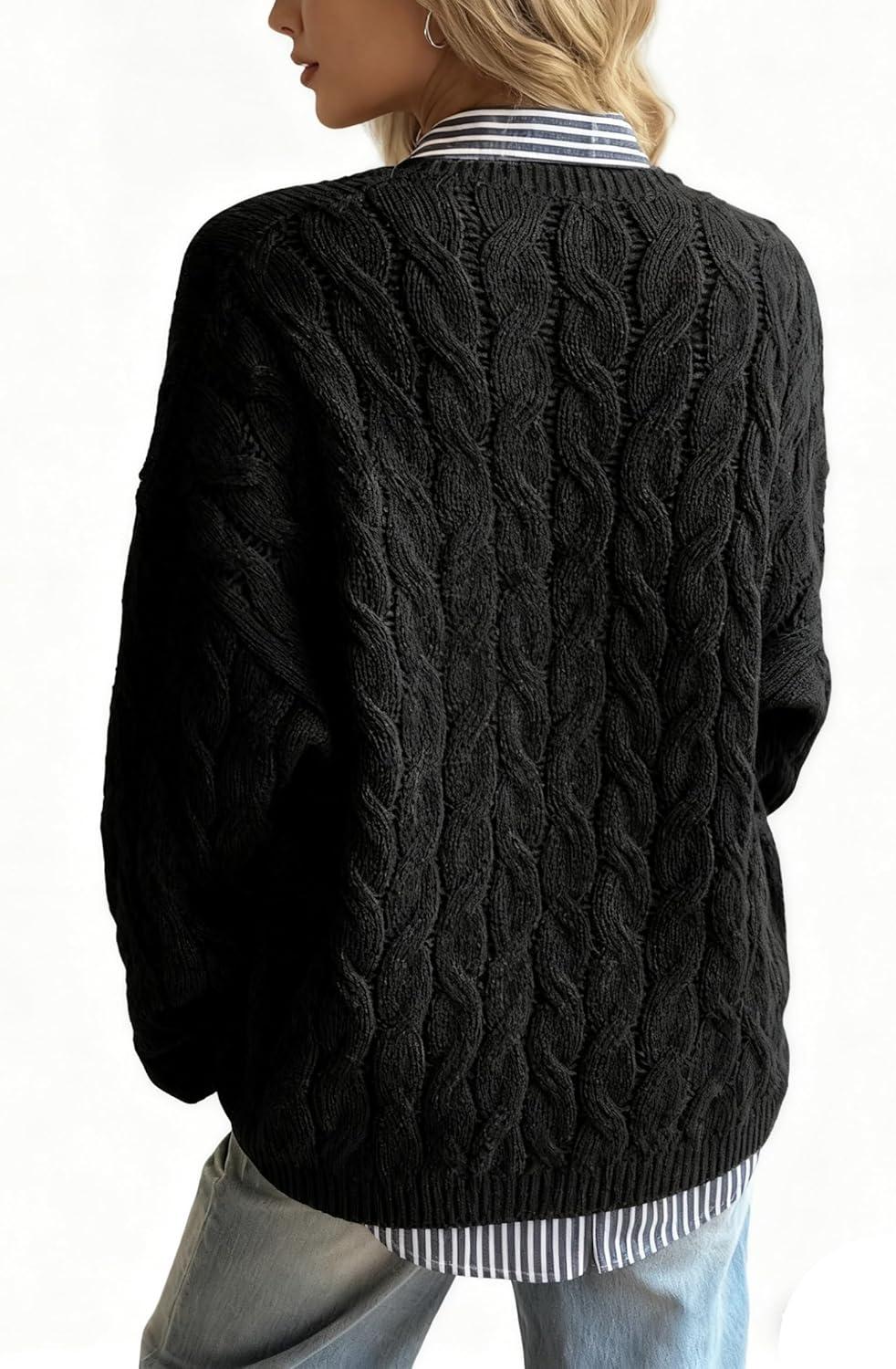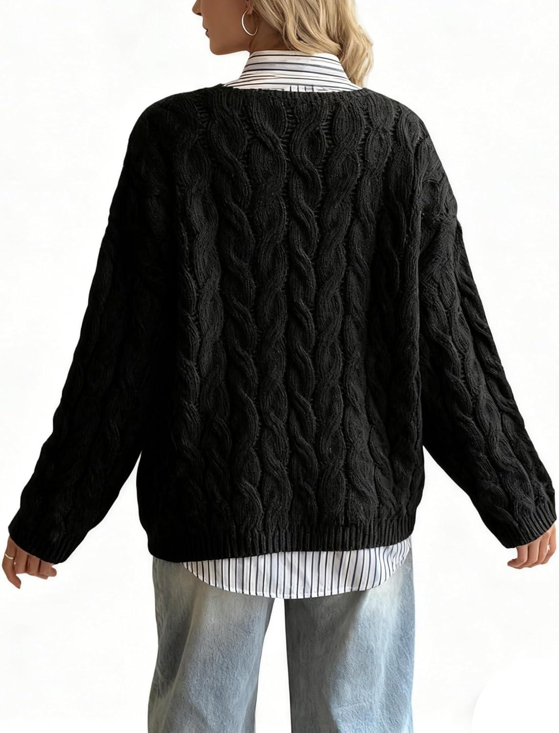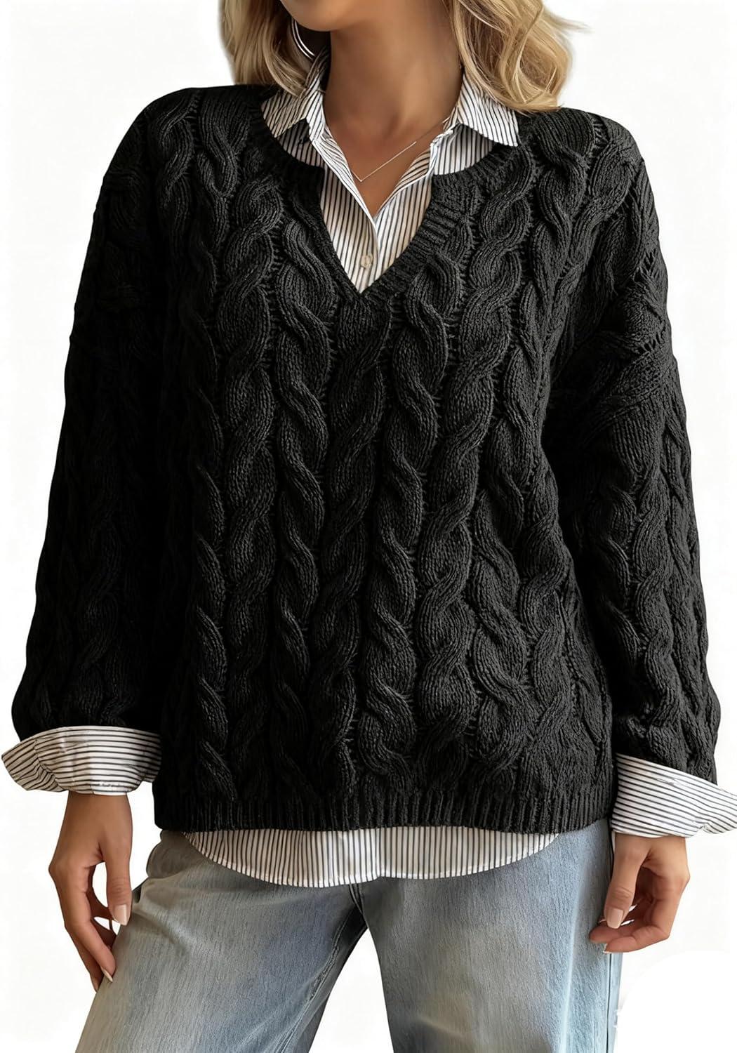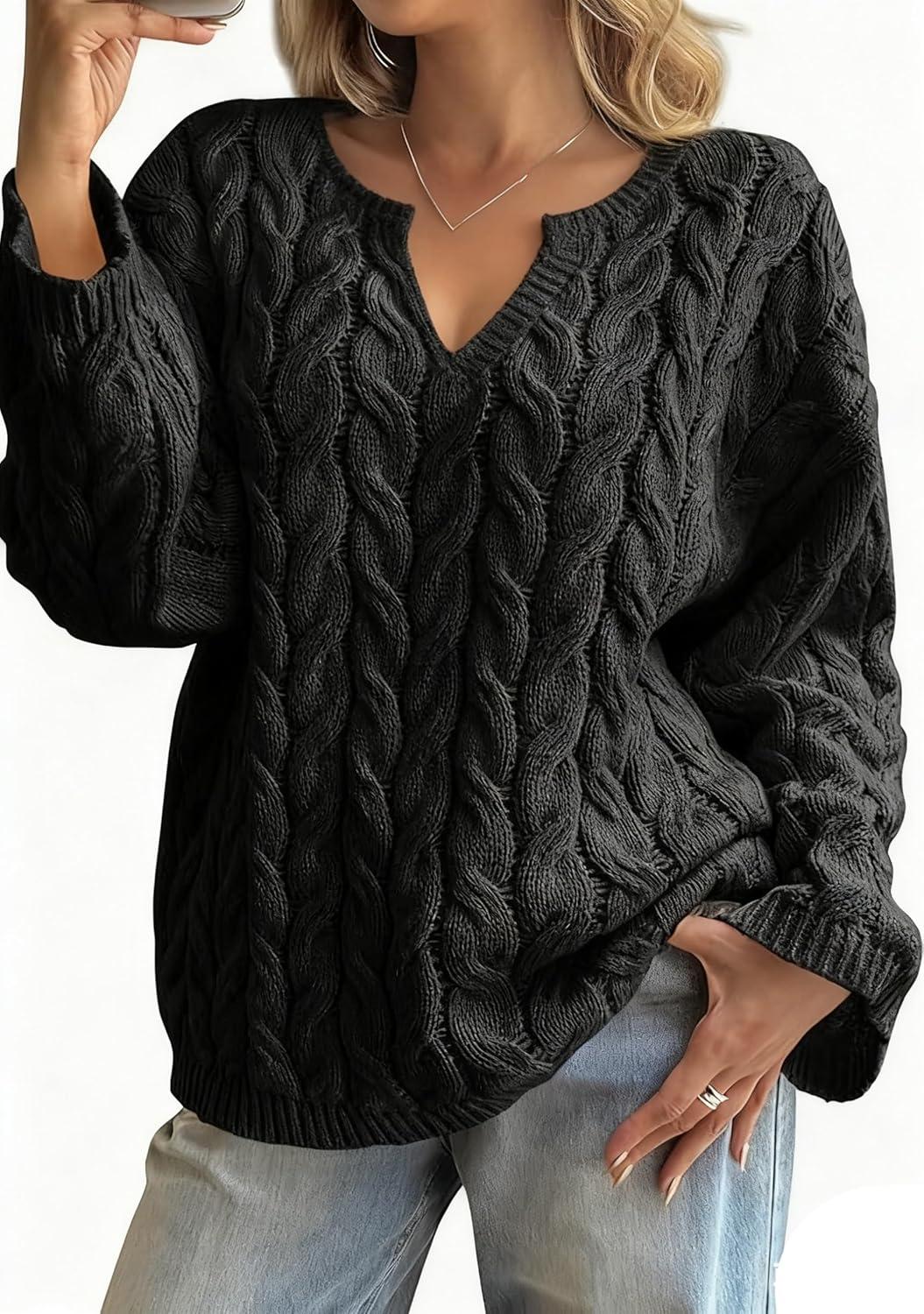 chouyatou Women Fall Notch V-Neck Cable Knit Pullover Sweater Loose Winter Chunky Cozy Sweater Jumper Top(Black)
