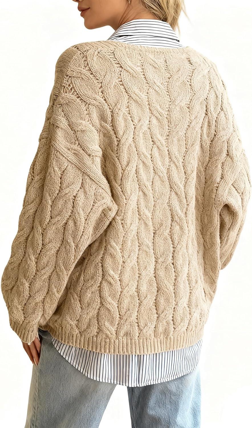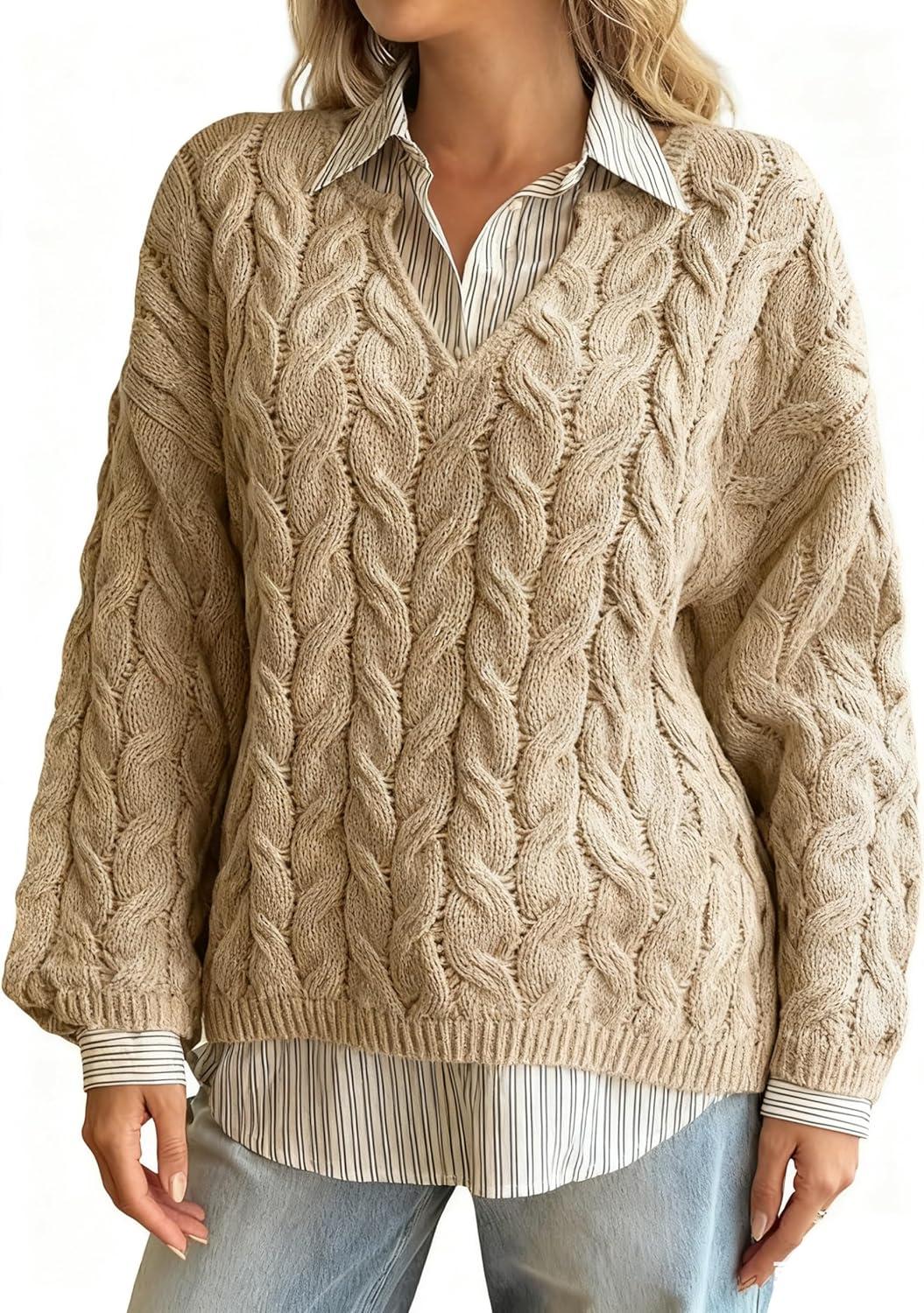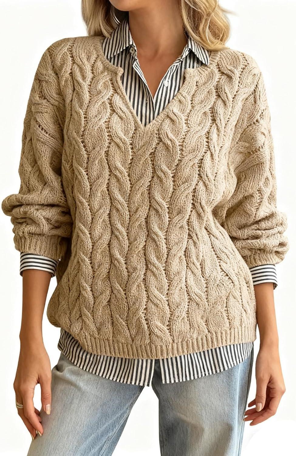 chouyatou Women Fall Notch V-Neck Cable Knit Pullover Sweater Loose Winter Chunky Cozy Sweater Jumper Top(Khaki)