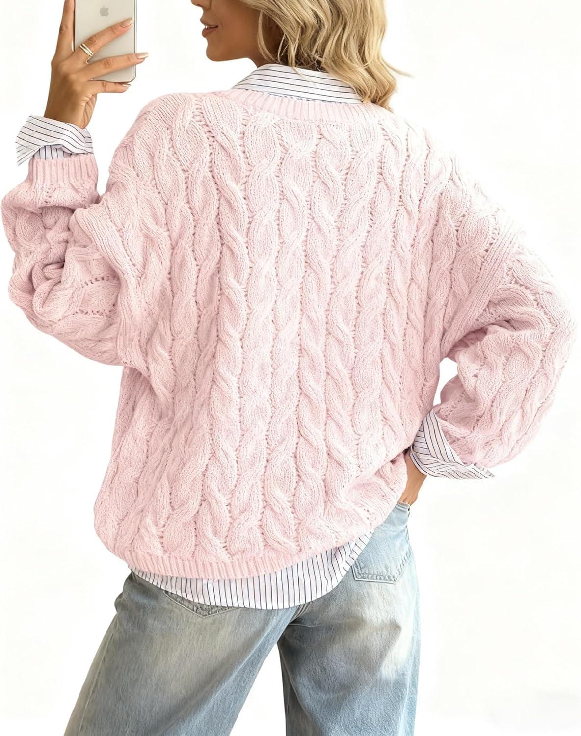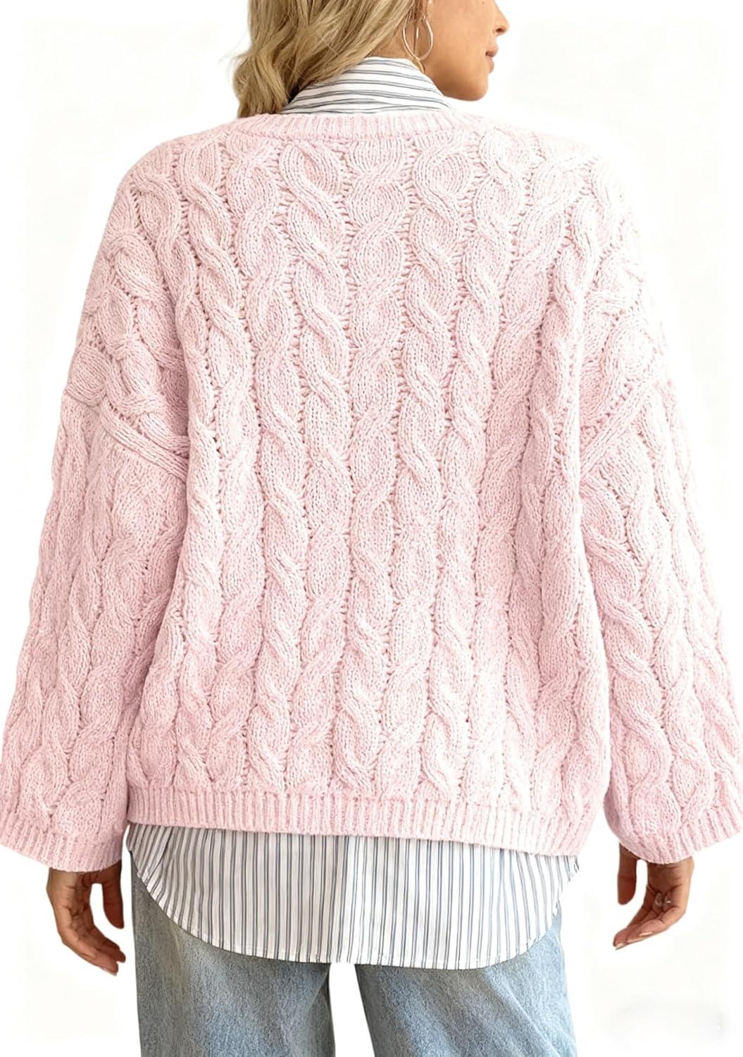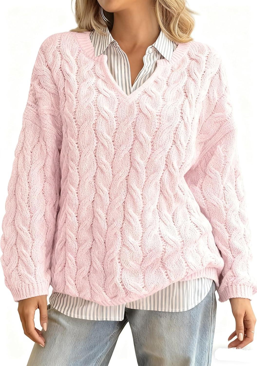 chouyatou Women Fall Notch V-Neck Cable Knit Pullover Sweater Loose Winter Chunky Cozy Sweater Jumper Top(Pink)