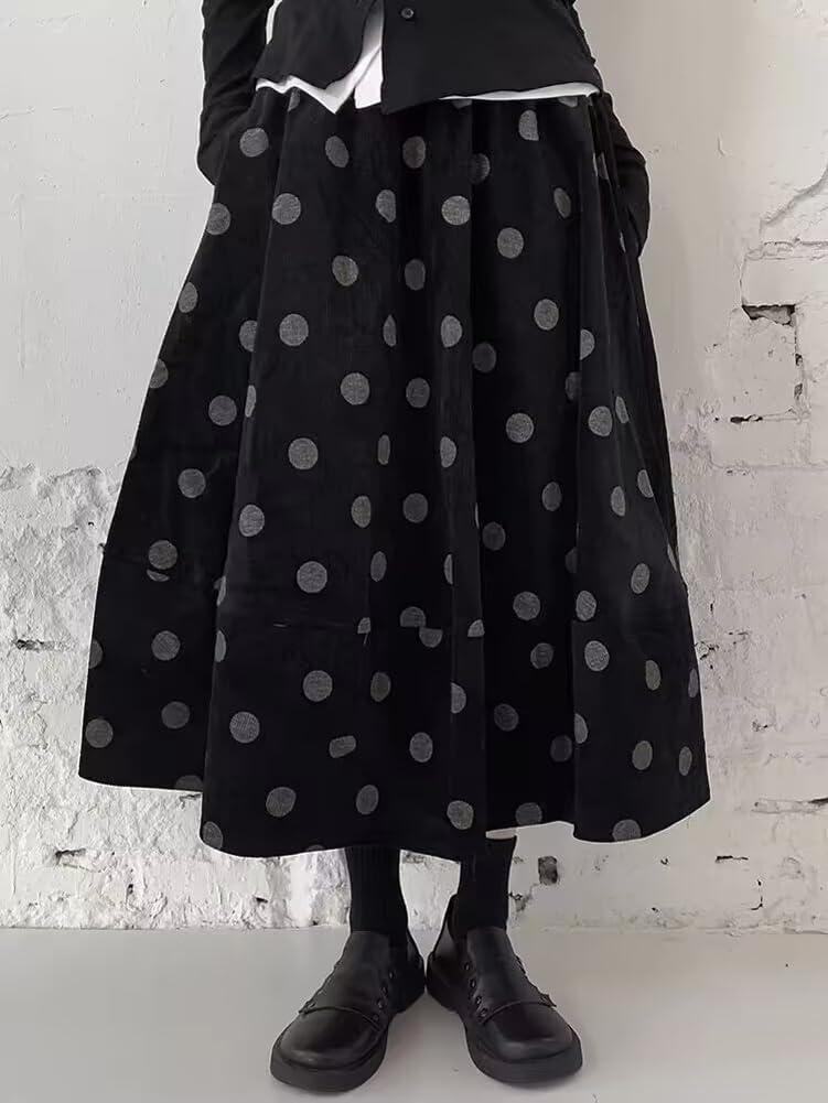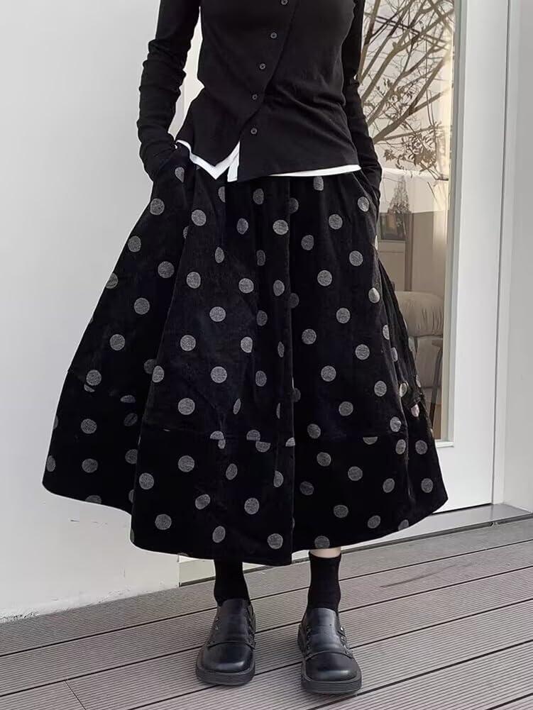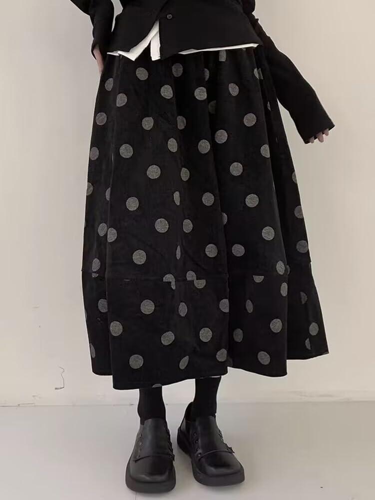 chouyatou Women Fall Y2K Polka Dot Coduroy Skirt Elastic Waist Winter A-Line Flowy Pleated Midi Long Skirt(Black Grey)