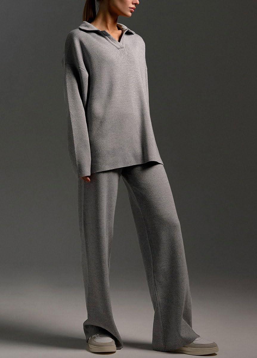 chouyatou Women's 2 Piece Lounge Sets Polo Collared Sweater Full Length Pant Two Piece Sweater Pant Outfits(Grey)