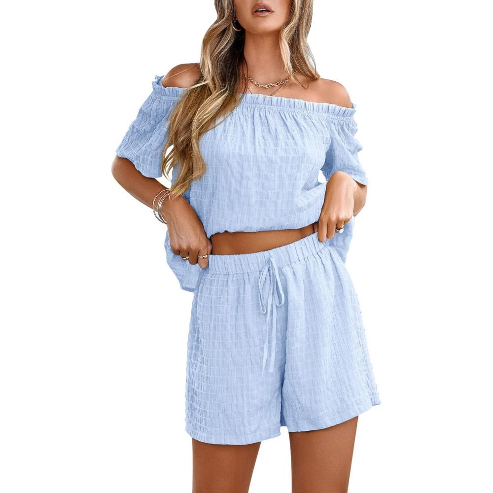 Be the first to review “chouyatou Women’s 2 Piece Outfit Off Shoulder Short Sleeve Blouse Tops and Elastic Waist Mini Shorts Set(Light Blue)”