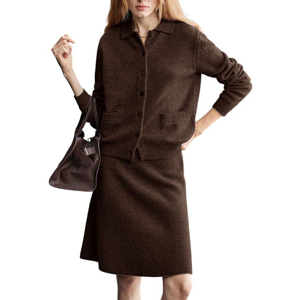 chouyatou Women’s 2 Piece Sweater Skirt Set Button Down Lapel Cardigan Midi Skirt Sets Travel Matching Outfits(Brown)
