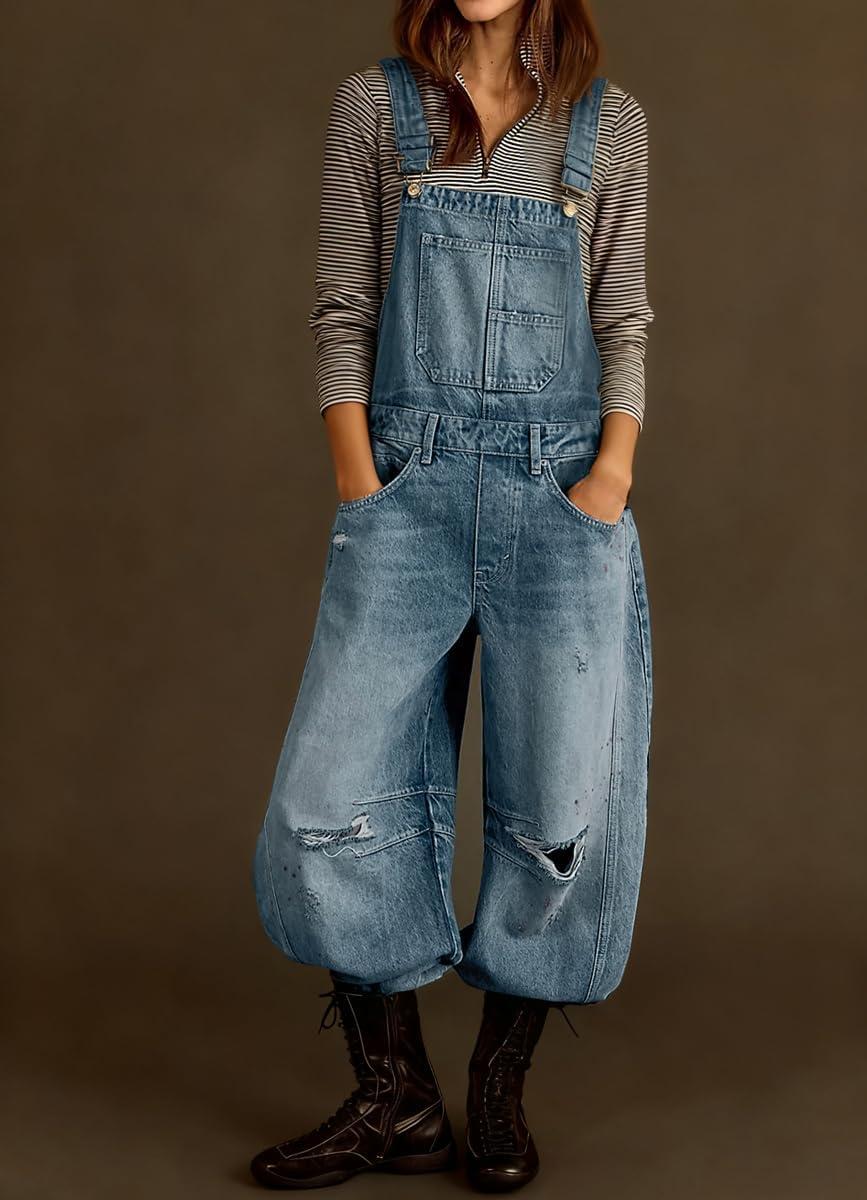 imagechouyatou Womens 2025 Baggy Adjustable Strap Denim Bib Overall Distressed Wide Leg Barrel Jeans Overall JumpsuitsBlue