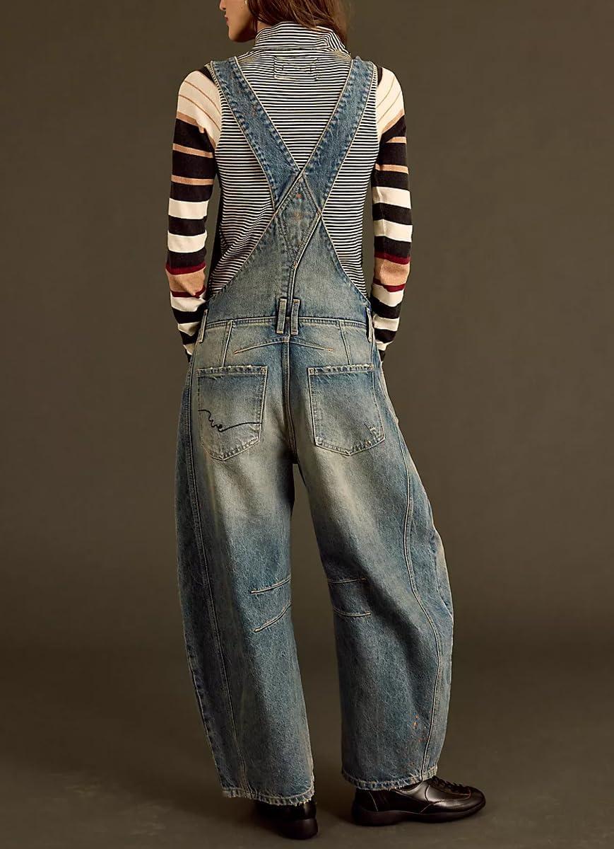 imagechouyatou Womens 2025 Baggy Adjustable Strap Denim Bib Overall Distressed Wide Leg Barrel Jeans Overall JumpsuitsRetro Blue