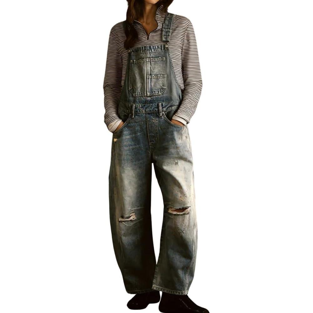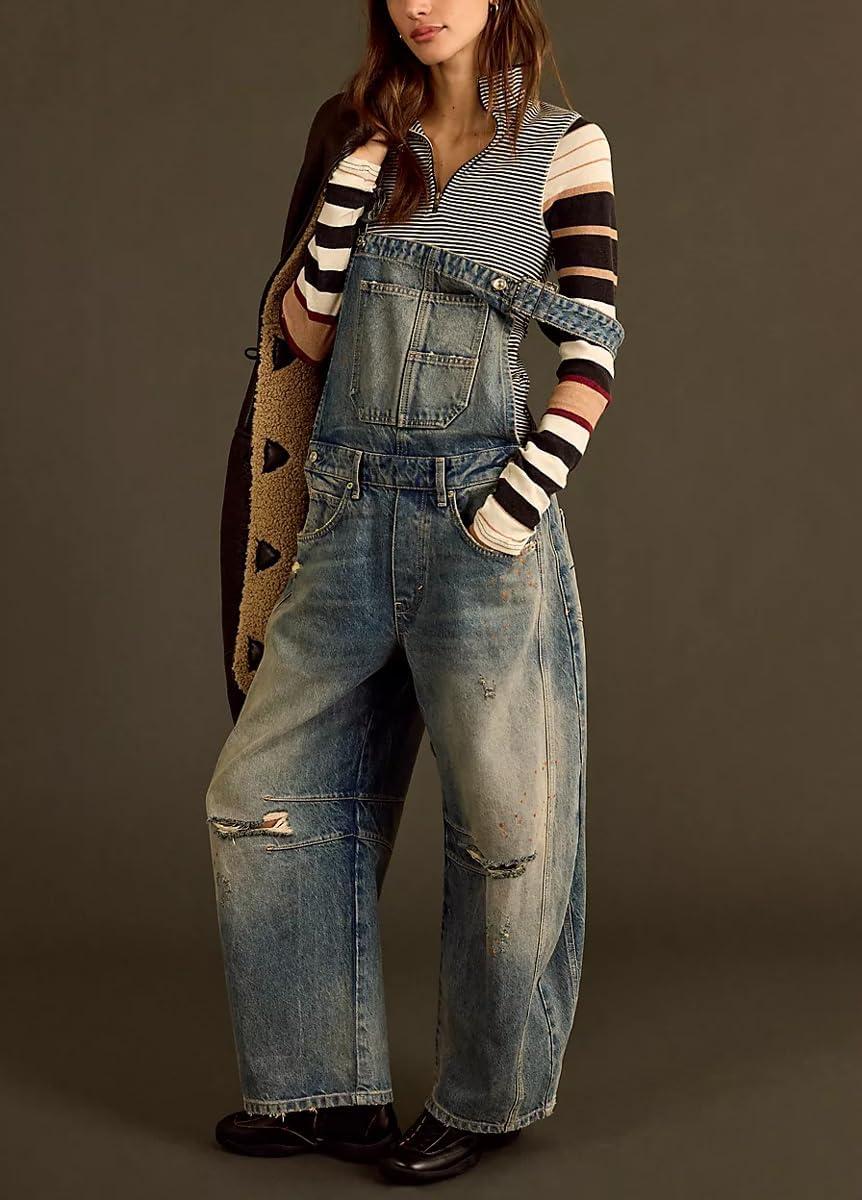 chouyatou Women's 2025 Baggy Adjustable Strap Denim Bib Overall Distressed Wide Leg Barrel Jeans Overall Jumpsuits(Retro Blue)