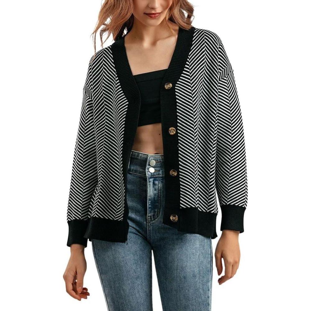 chouyatou Women’s 2025 Button Down V Neck Cardigans Herringbone Striped Sweater Cardigan Jacket Outerwear Coat(Black)
