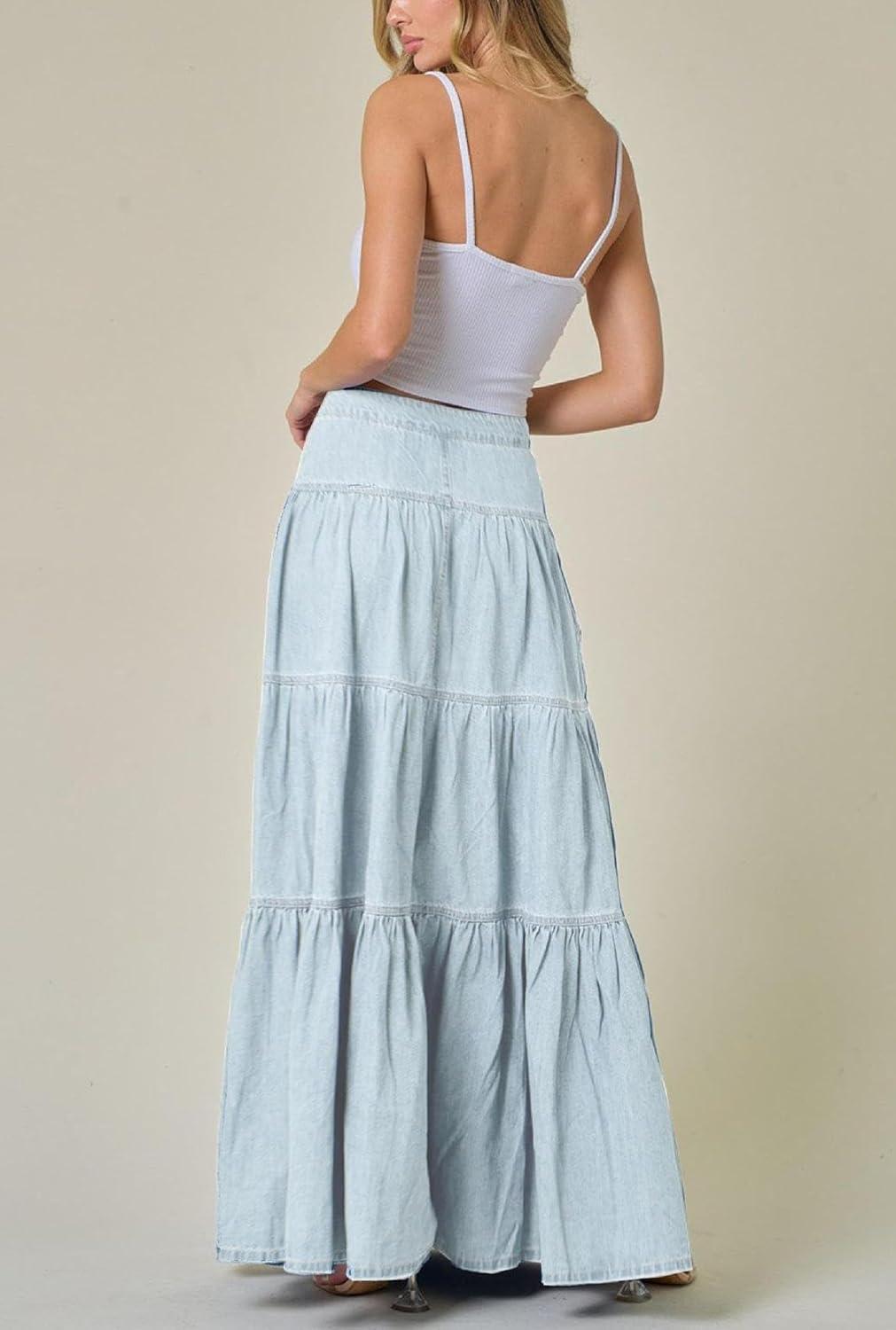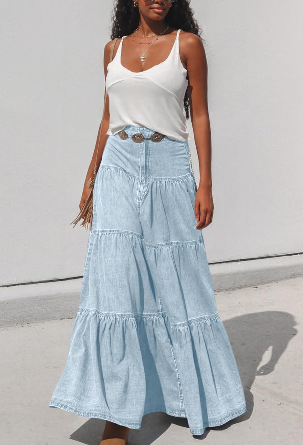 Get up to 50% off on chouyatou Women’s 2025 Casual A-Line Tiered Maxi Jean Skirt Flowy Swing Pleated Boho Long Denim Skirt(Light Blue) styles during our spring sale event.