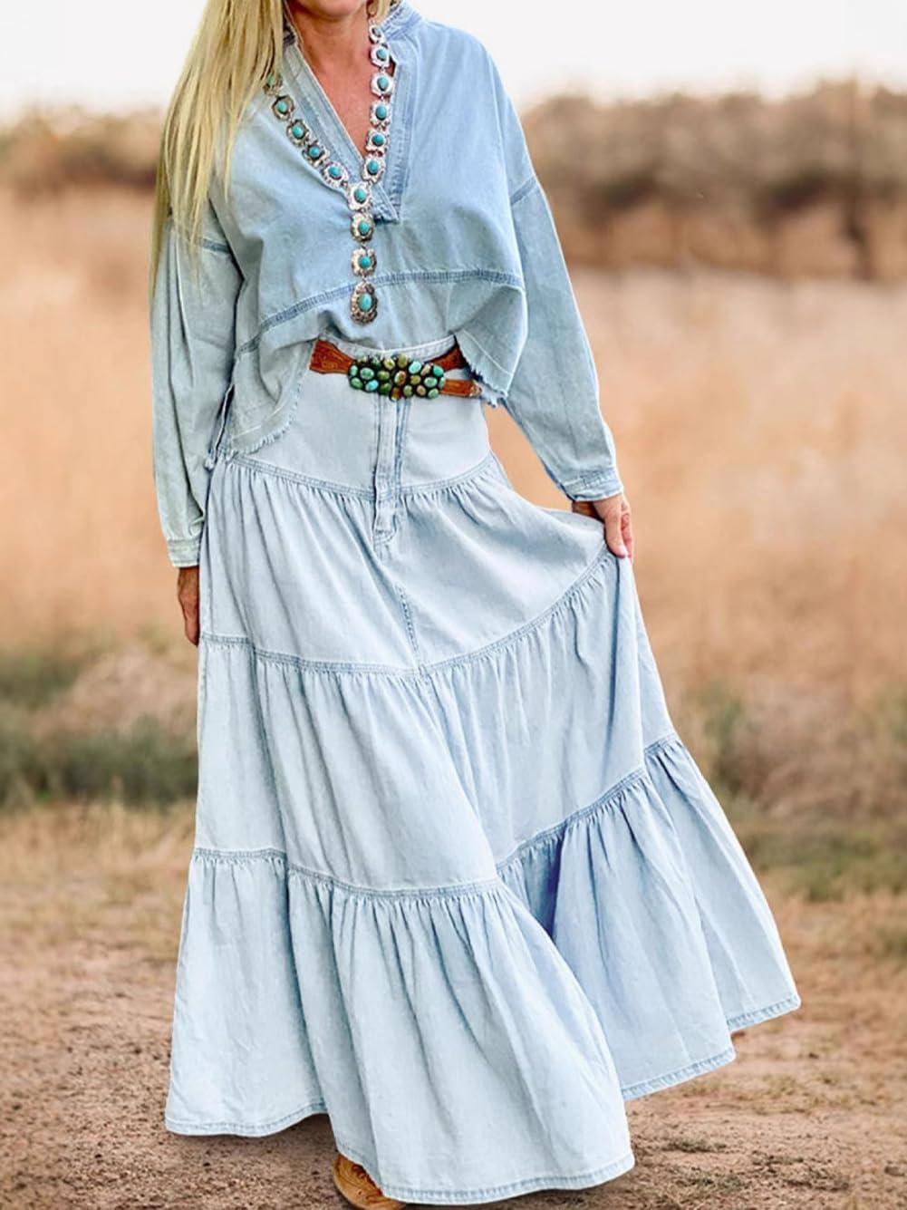 chouyatou Women's 2025 Casual A-Line Tiered Maxi Jean Skirt Flowy Swing Pleated Boho Long Denim Skirt(Light Blue)