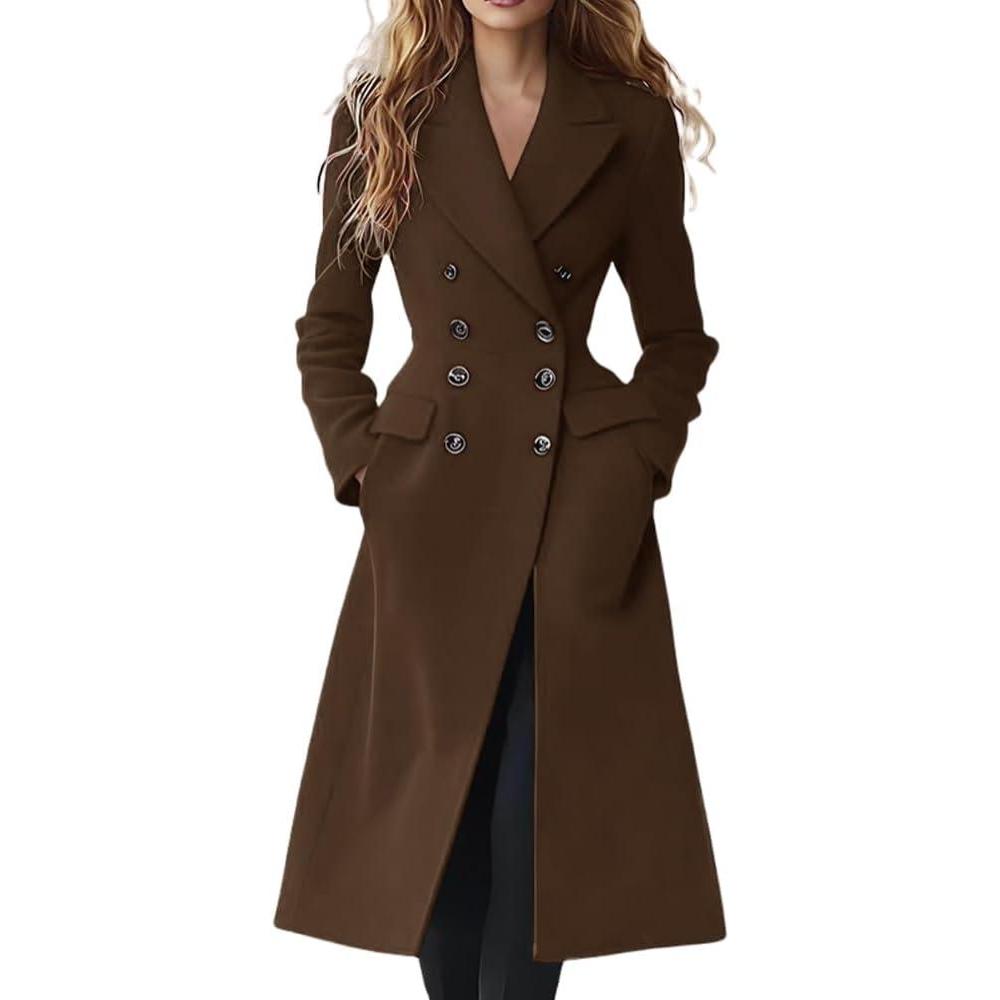 chouyatou Women’s 2025 Fall Double Breasted Wool Coat Formal Work Dressy Midi Long Winter Pea Coat(Brown)