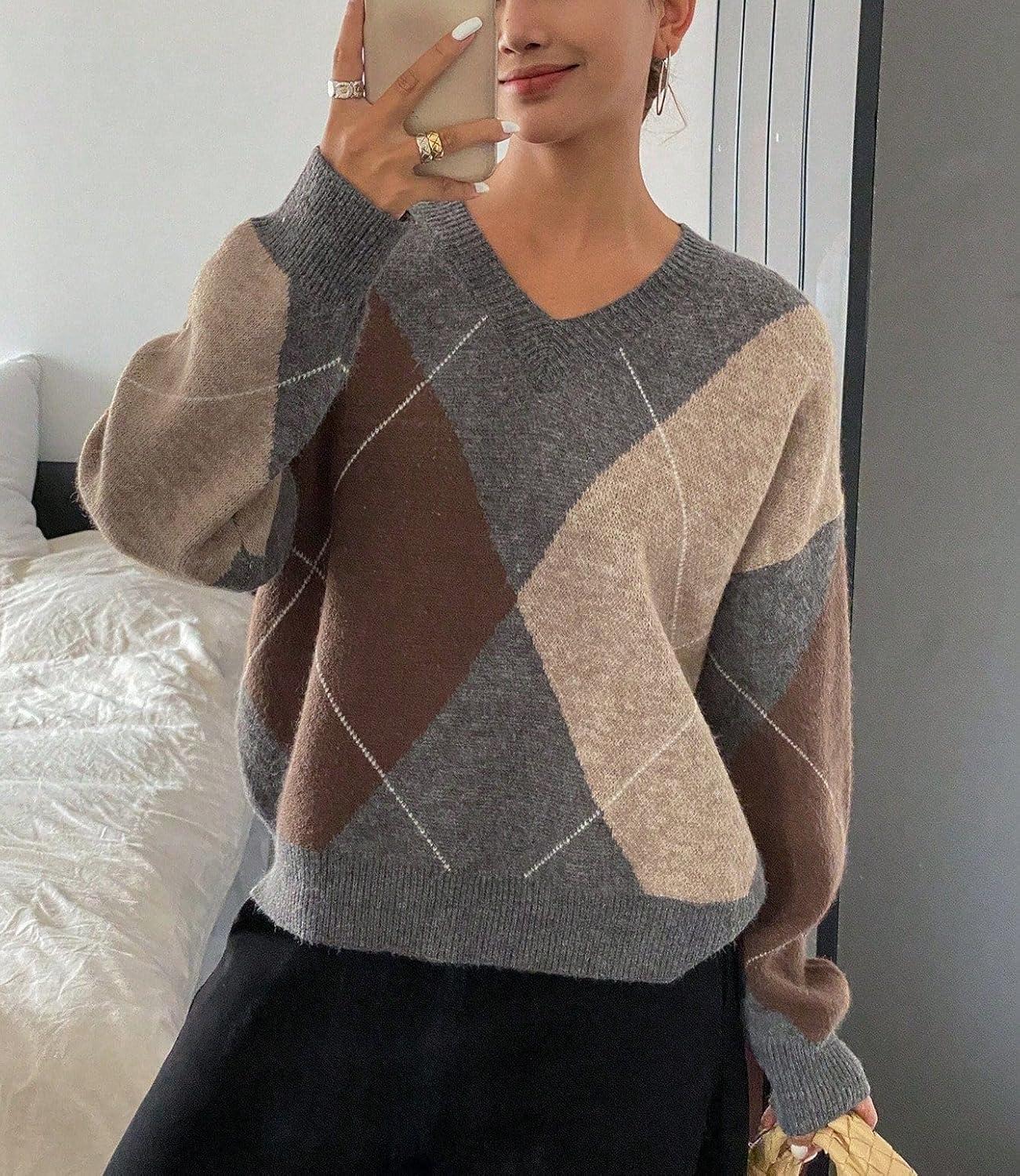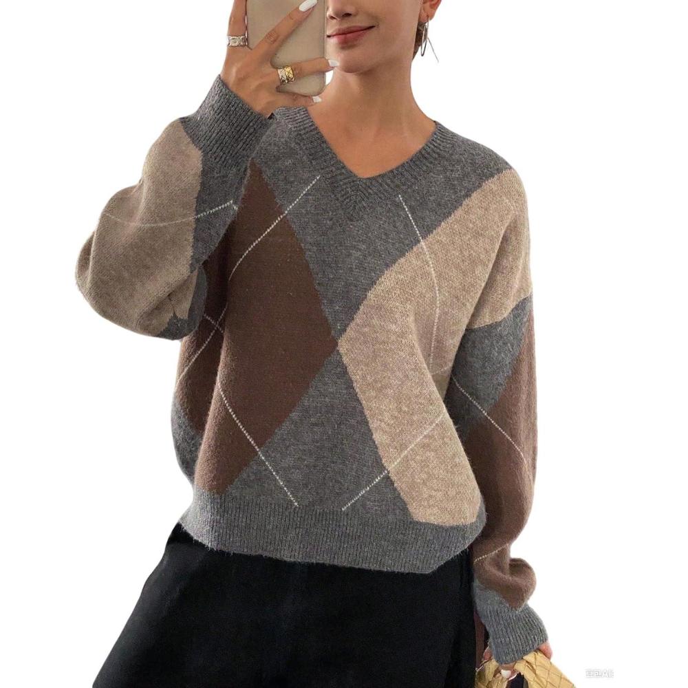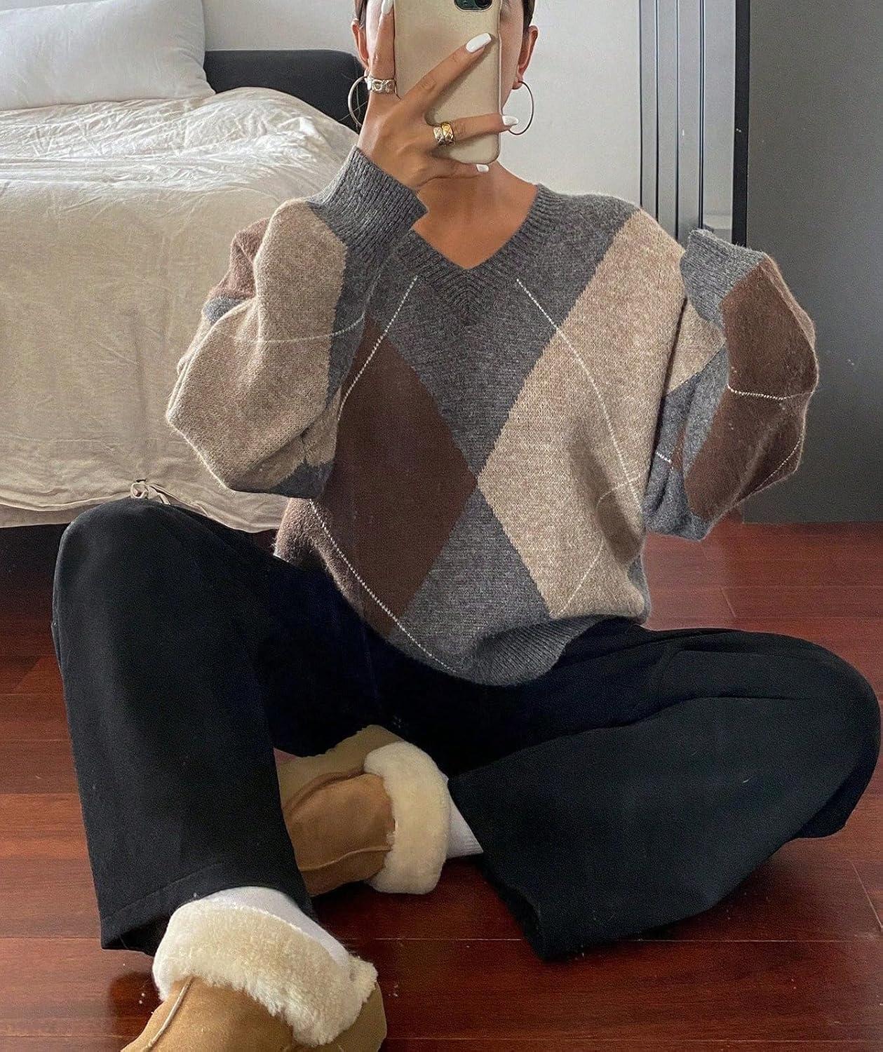 chouyatou Women’s 2025 Fall V-Neck Argyle Sweaters Pullover Oversized Chunky Knit Casual Sweater Top(Apricot Grey)