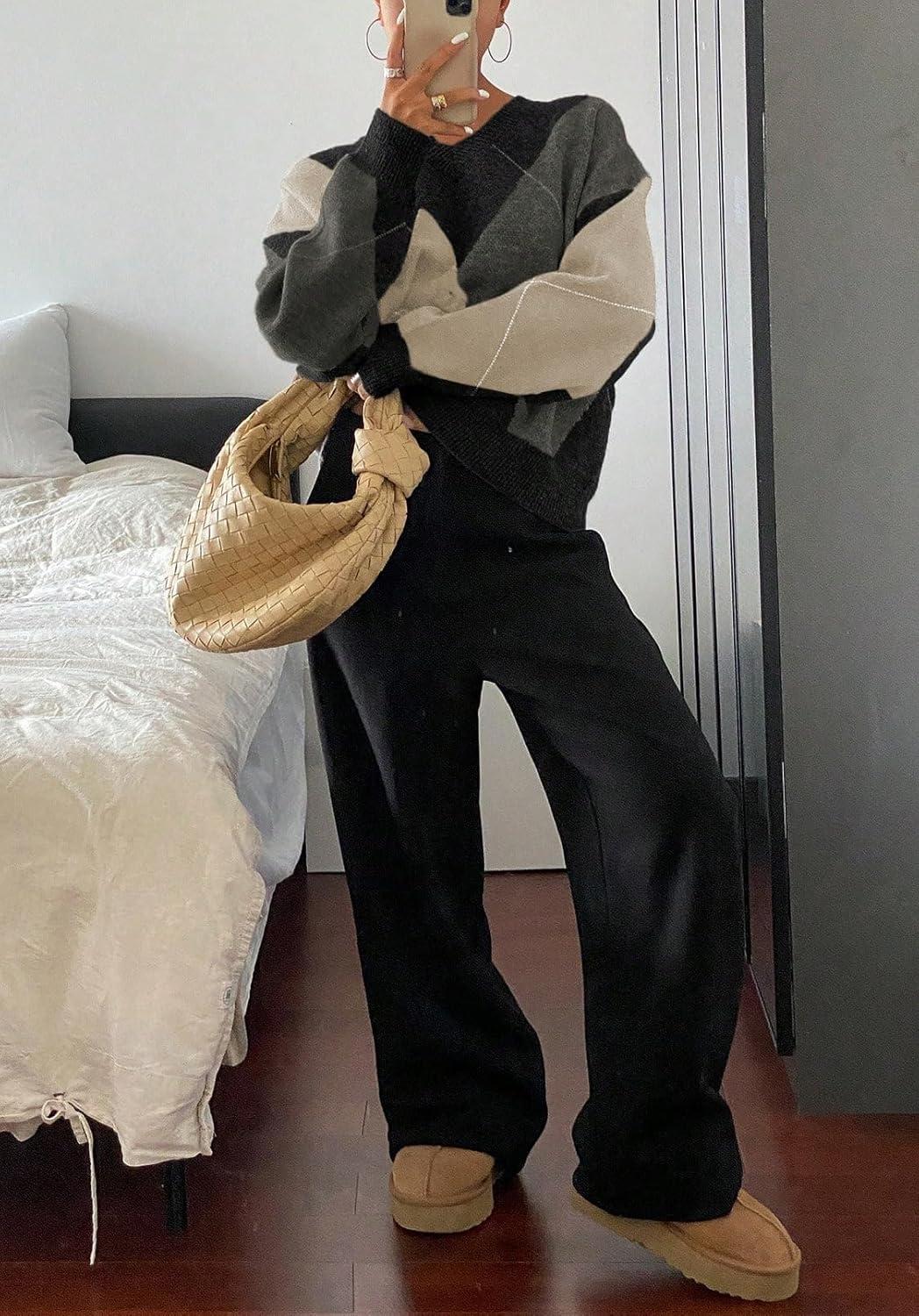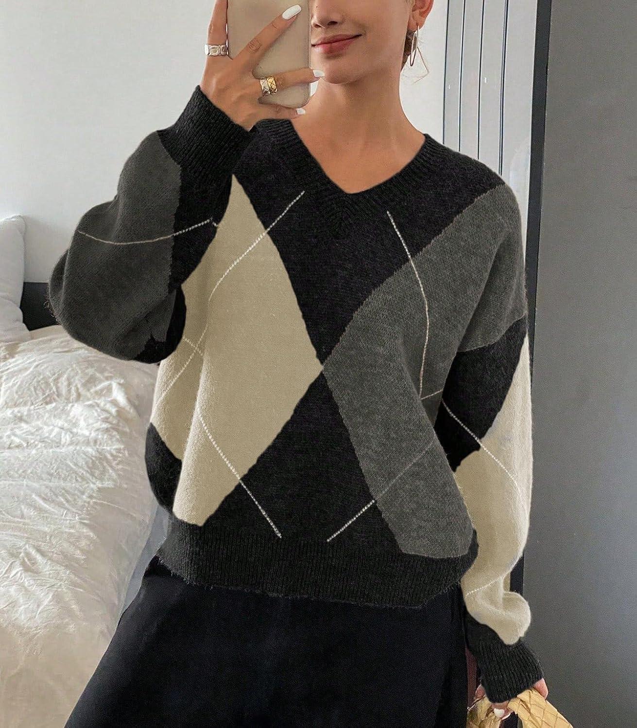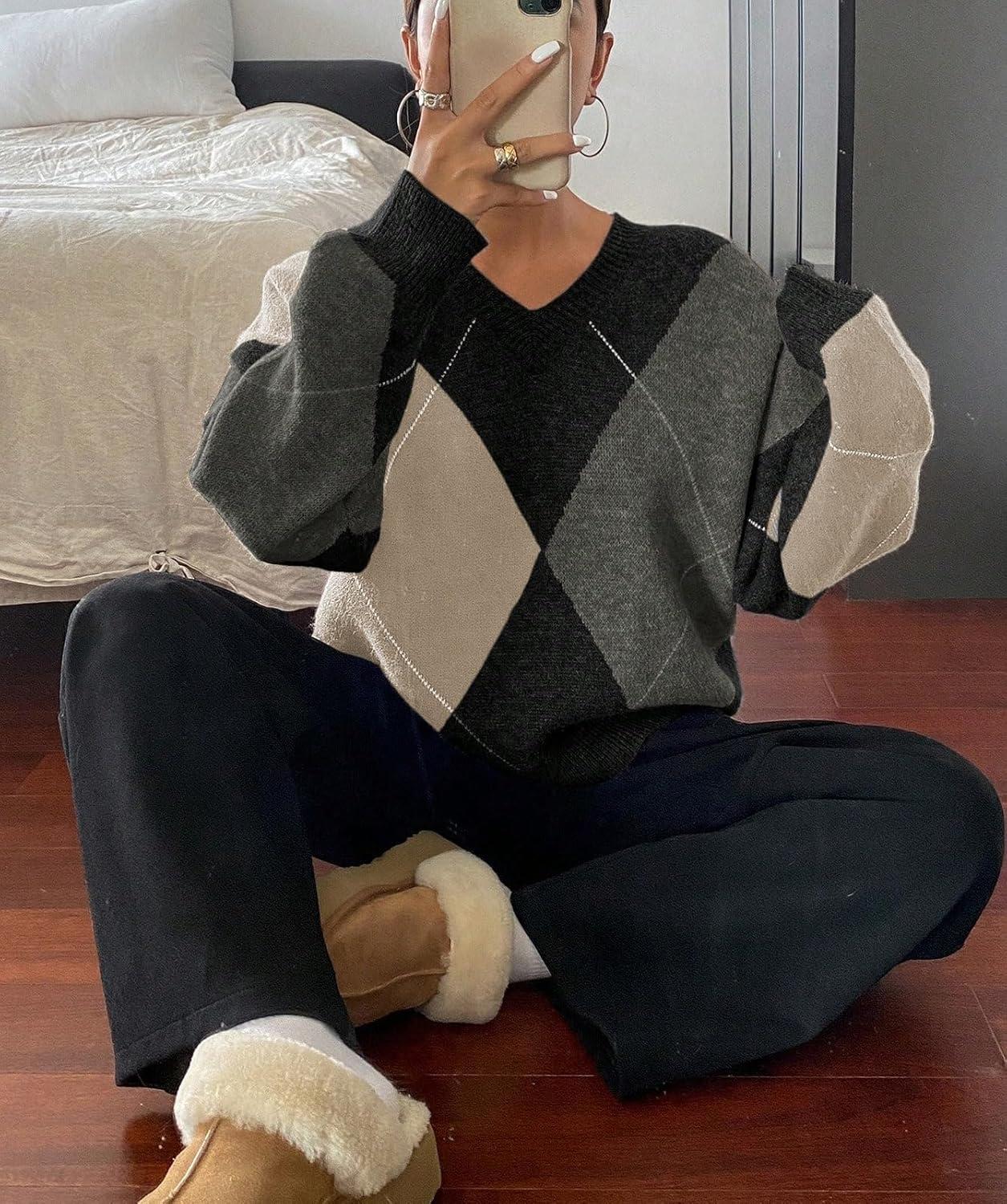 chouyatou Women’s 2025 Fall V-Neck Argyle Sweaters Pullover Oversized Chunky Knit Casual Sweater Top(Black Grey)