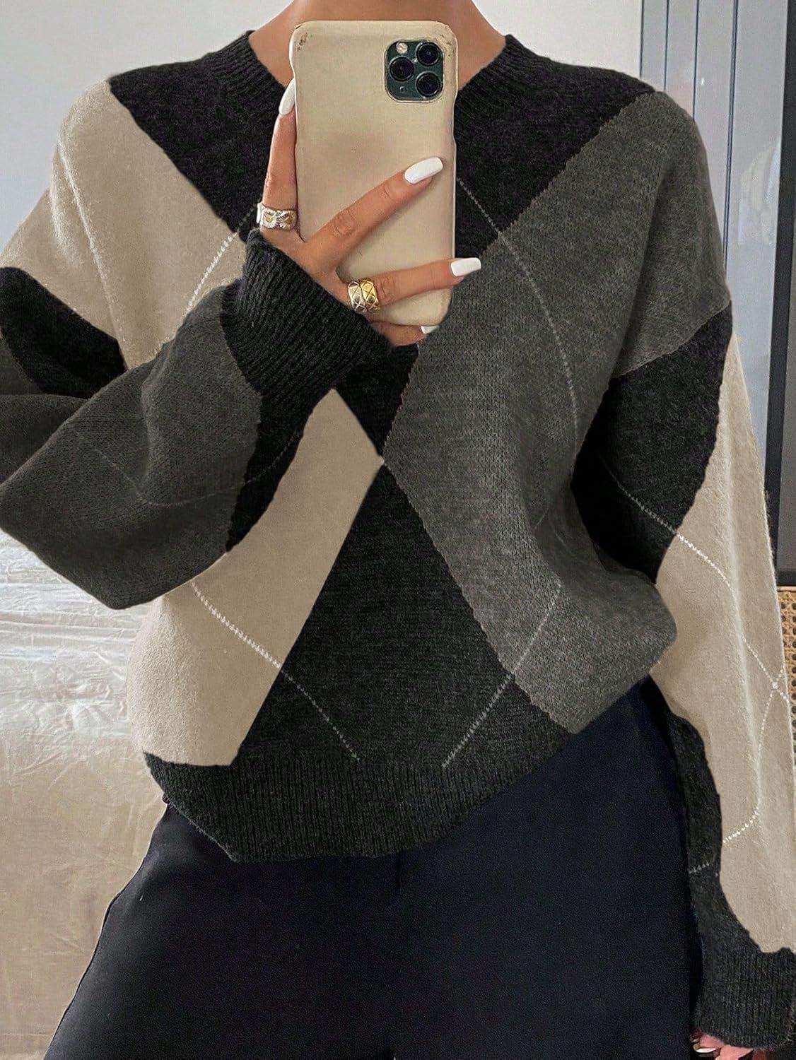 imagechouyatou Womens 2025 Fall VNeck Argyle Sweaters Pullover Oversized Chunky Knit Casual Sweater TopBlack Grey