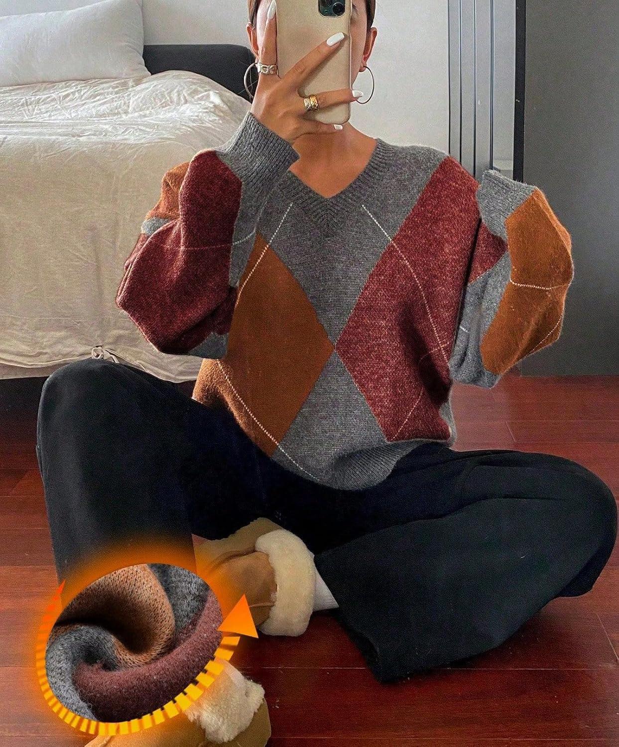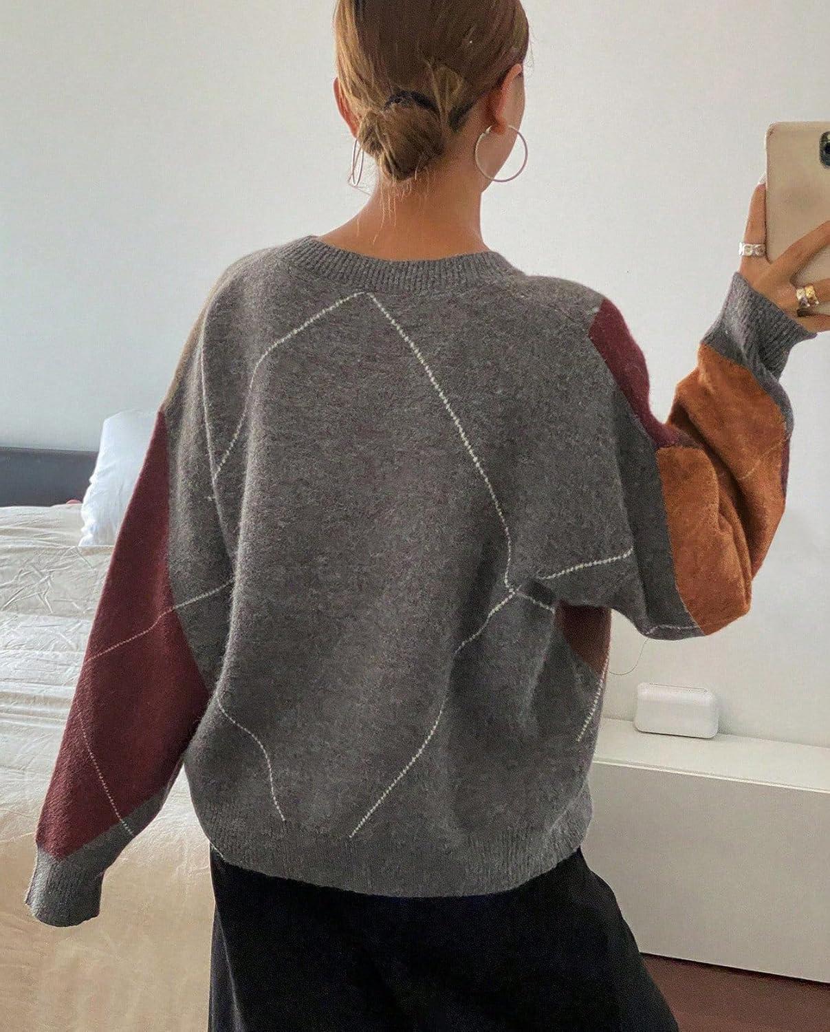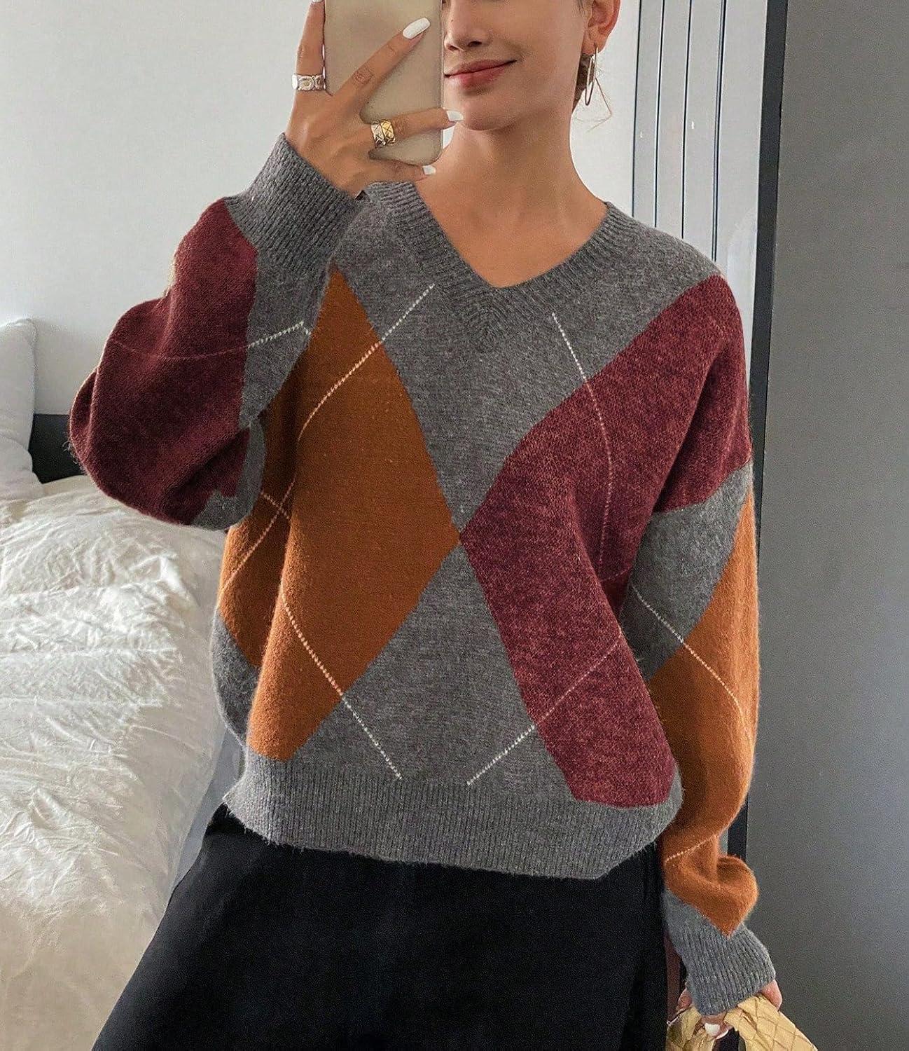chouyatou Women’s 2025 Fall V-Neck Argyle Sweaters Pullover Oversized Chunky Knit Casual Sweater Top(Coffee Grey)