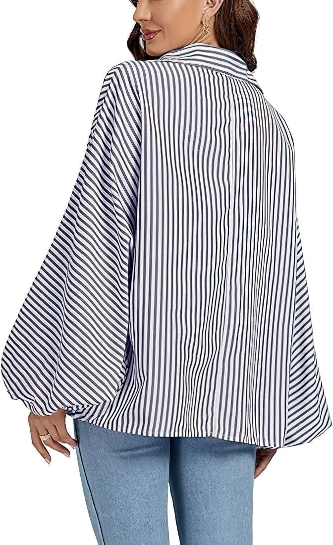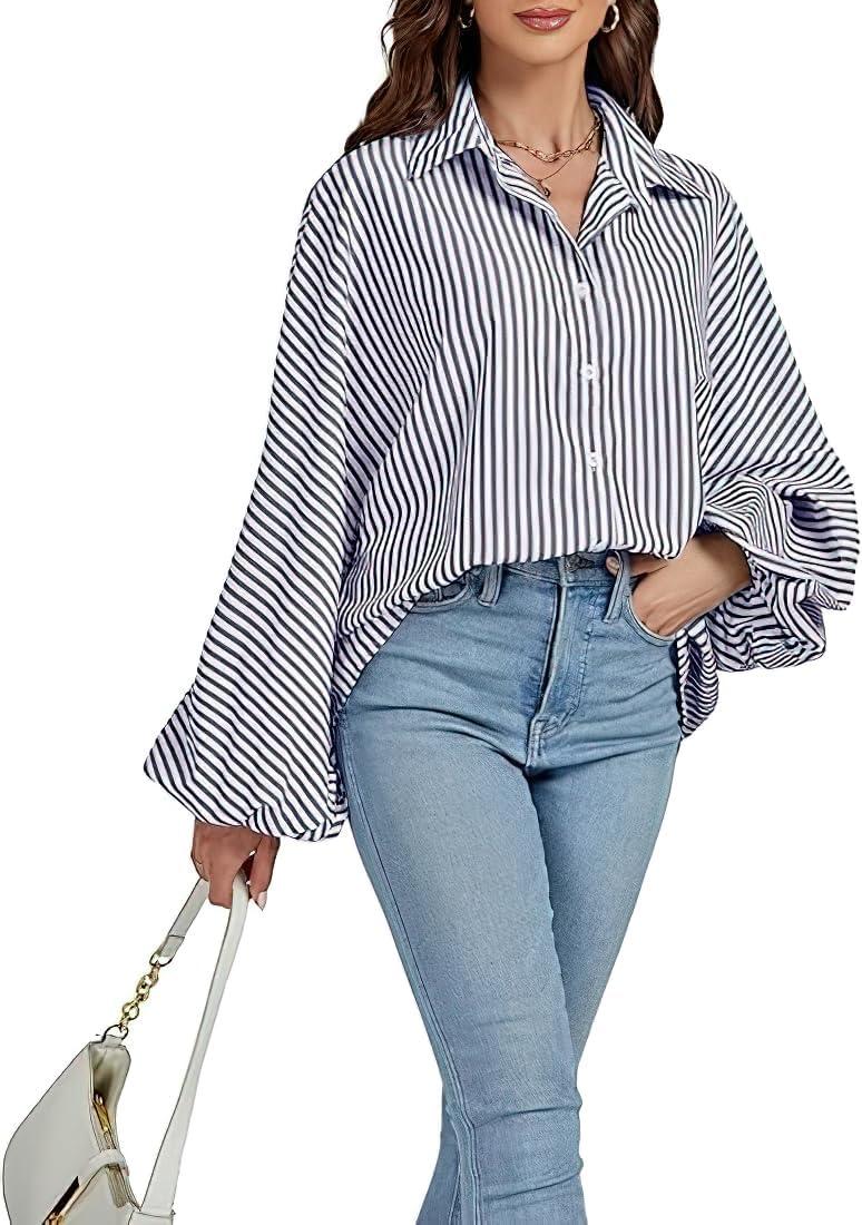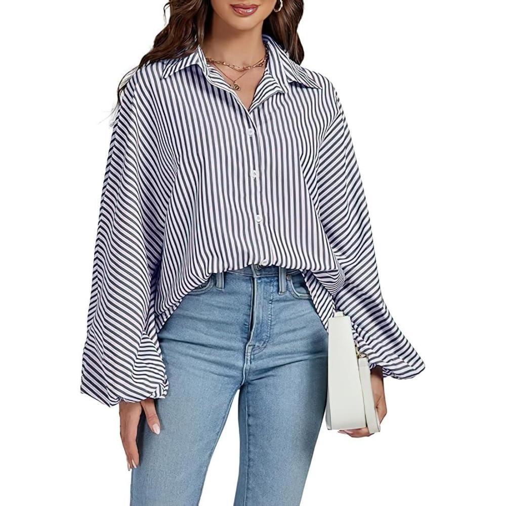 CHOUYATOU Women’s 2026 Casual Striped Button Down Shirts Lantern Sleeve Collared Cotton Blouses Tops(Grey)