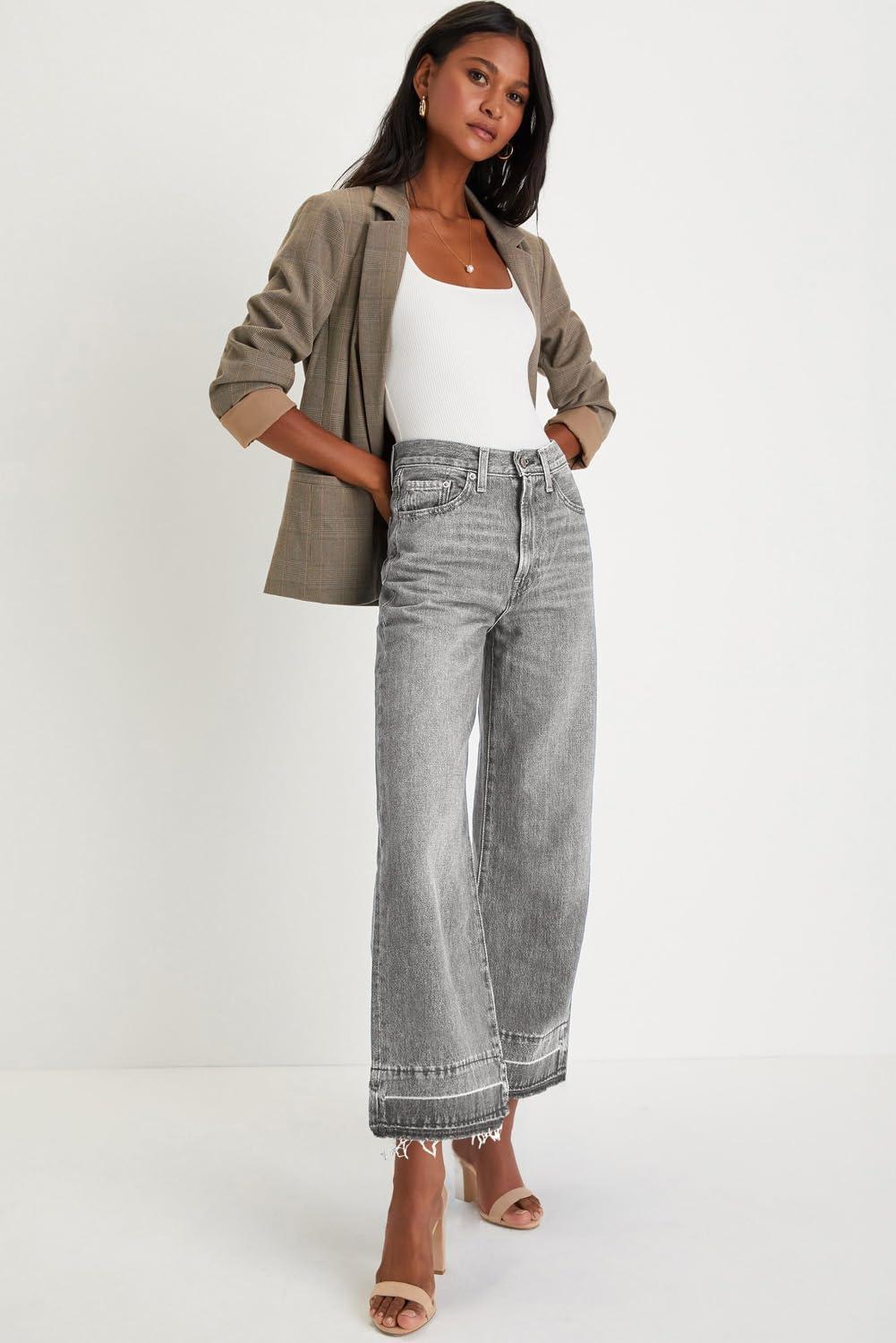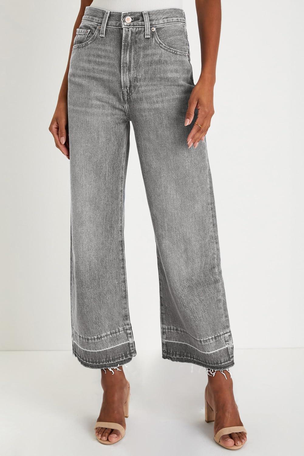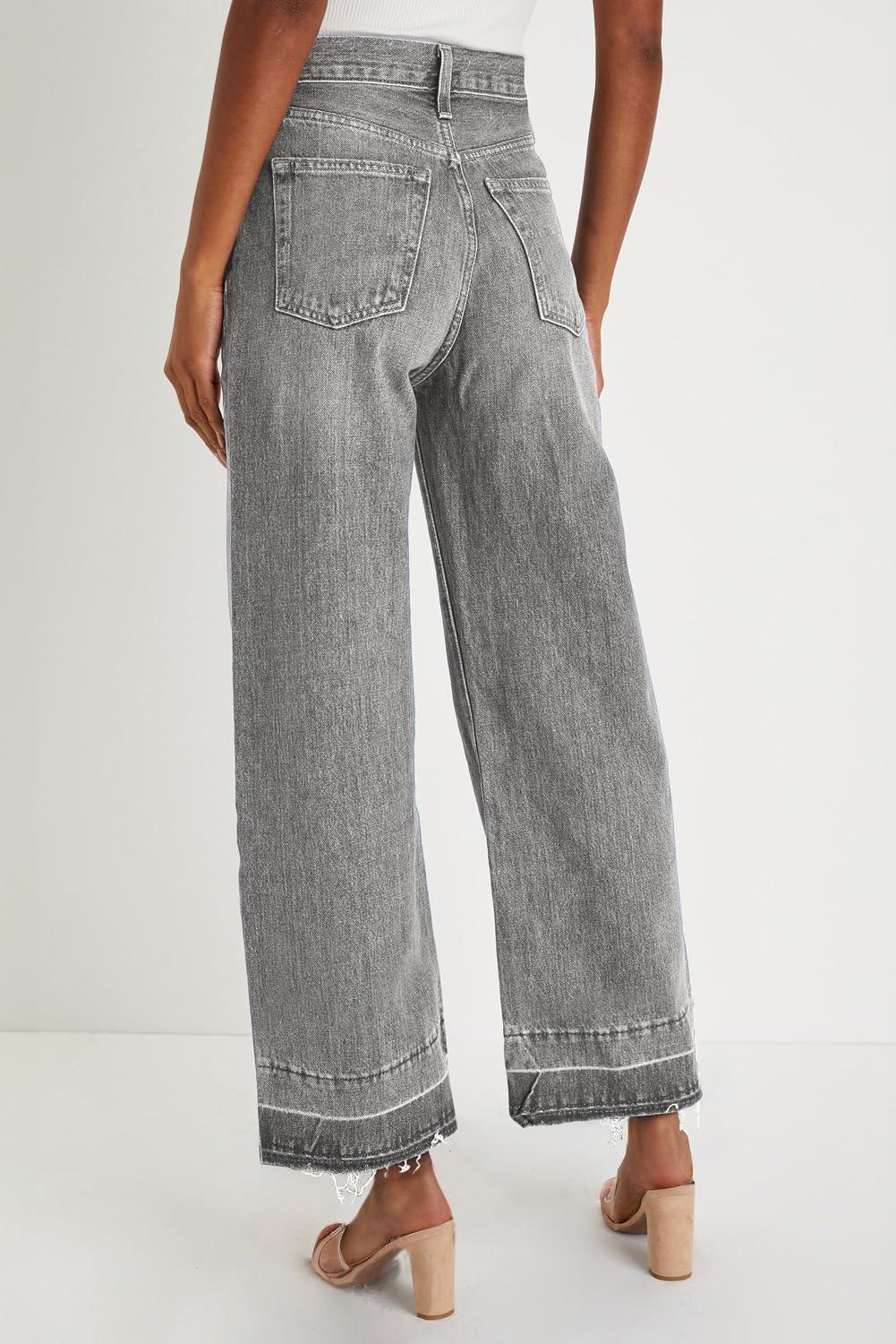CHOUYATOU Women’s 2026 Distressed Wide Leg Jeans High Waisted Fringe Capri Jeans Boyfriend Baggy Barrel Denim Pants(Gray)