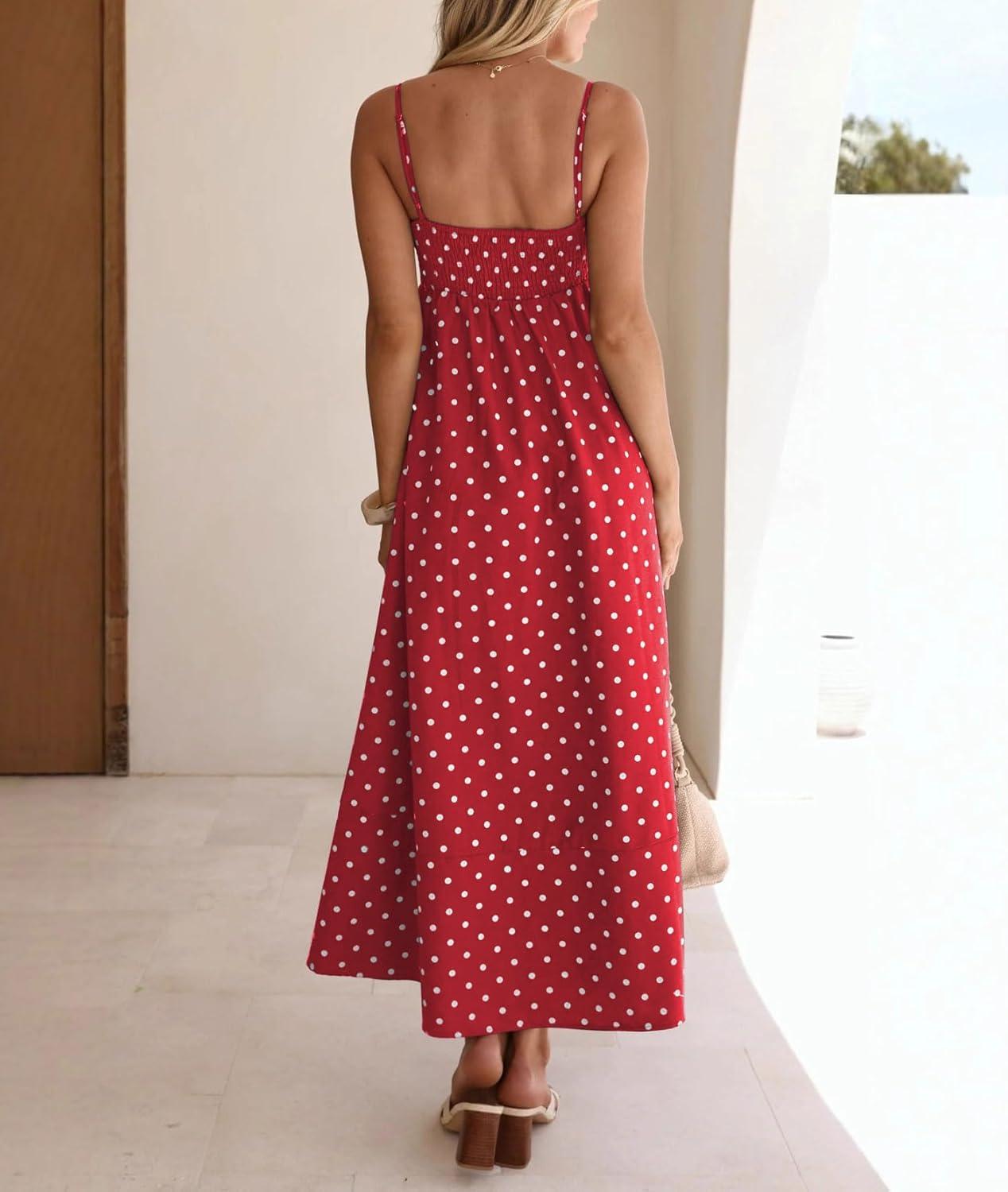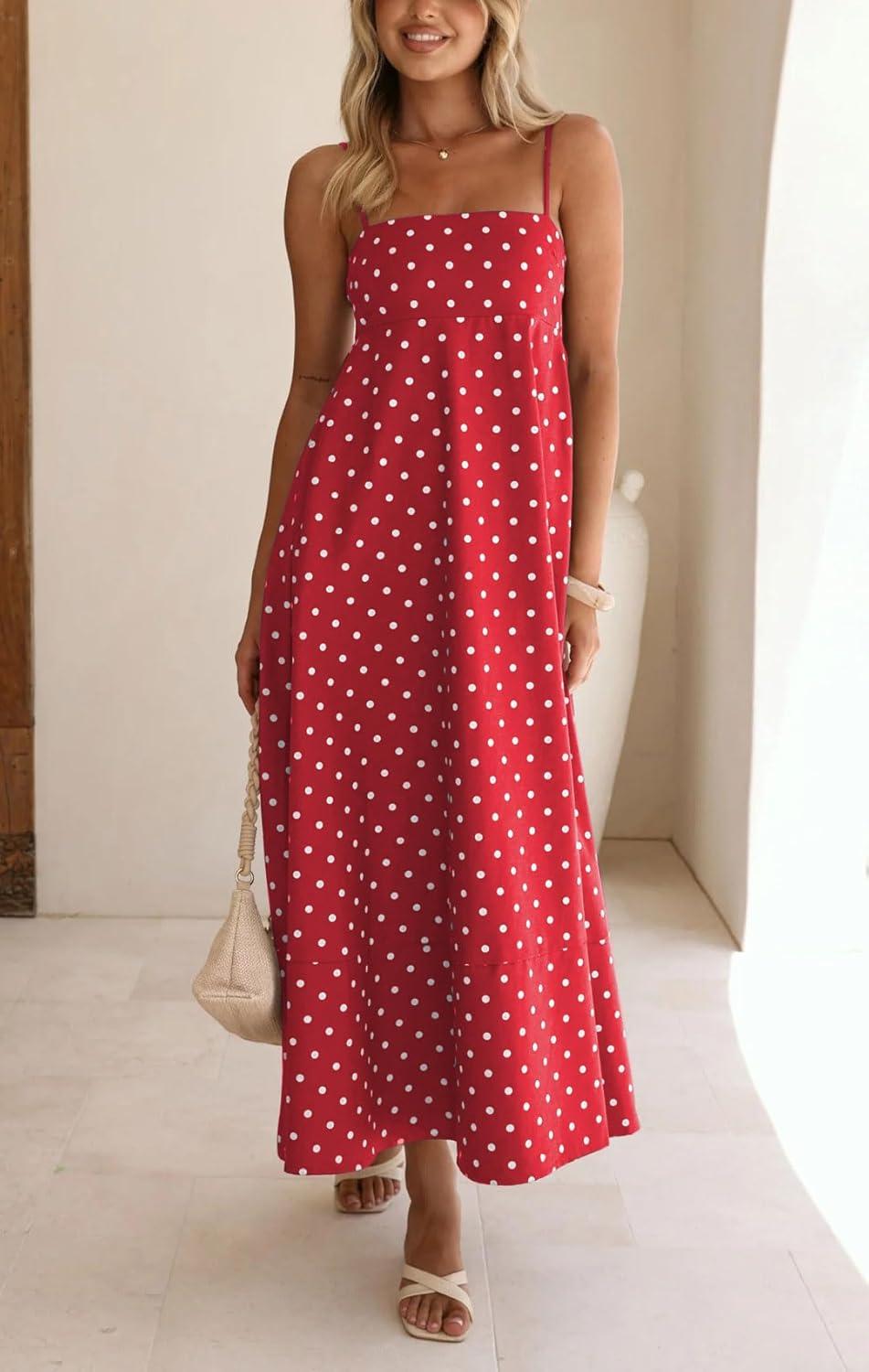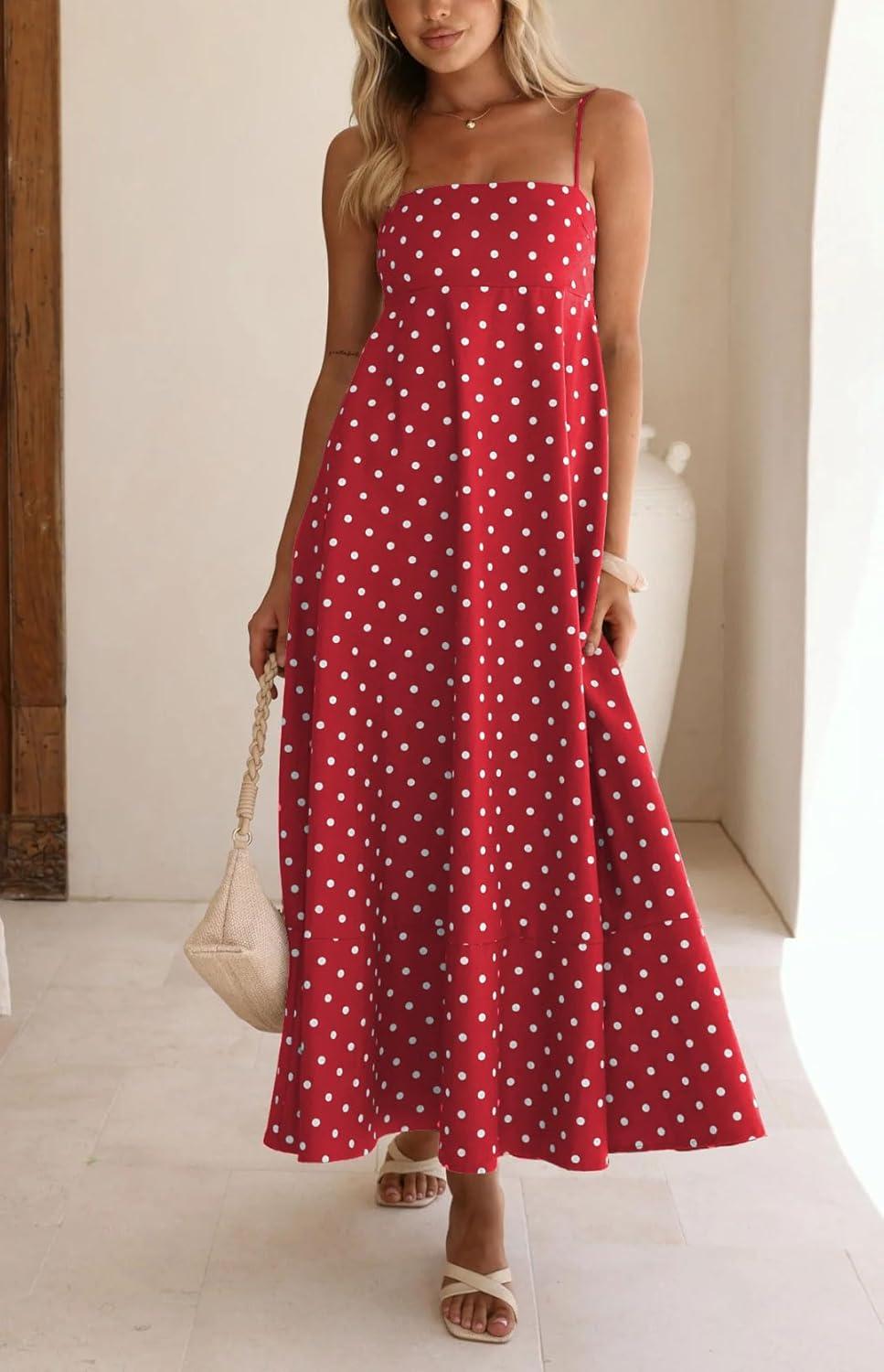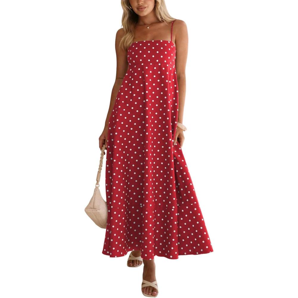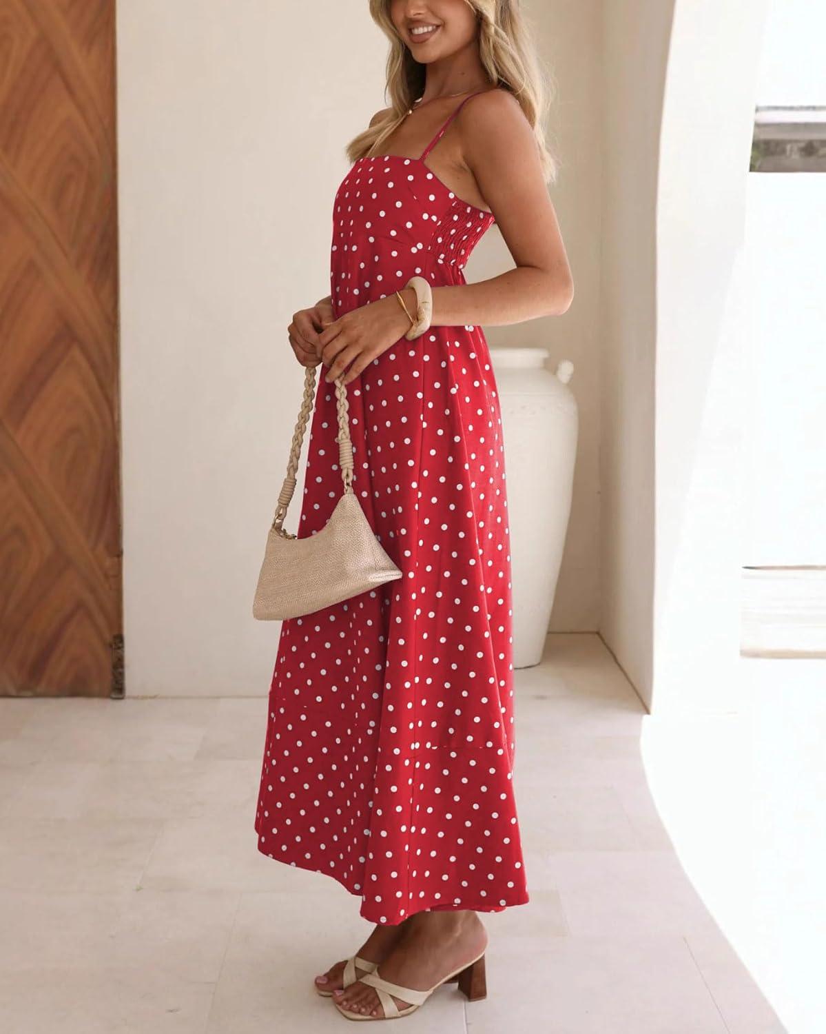 CHOUYATOU Women’s 2026 Vintage Polka Dot Maxi Dress Back Smocked Spaghetti Strap Ruffle Hem Swing Long Dress(Red)