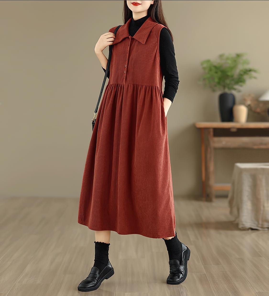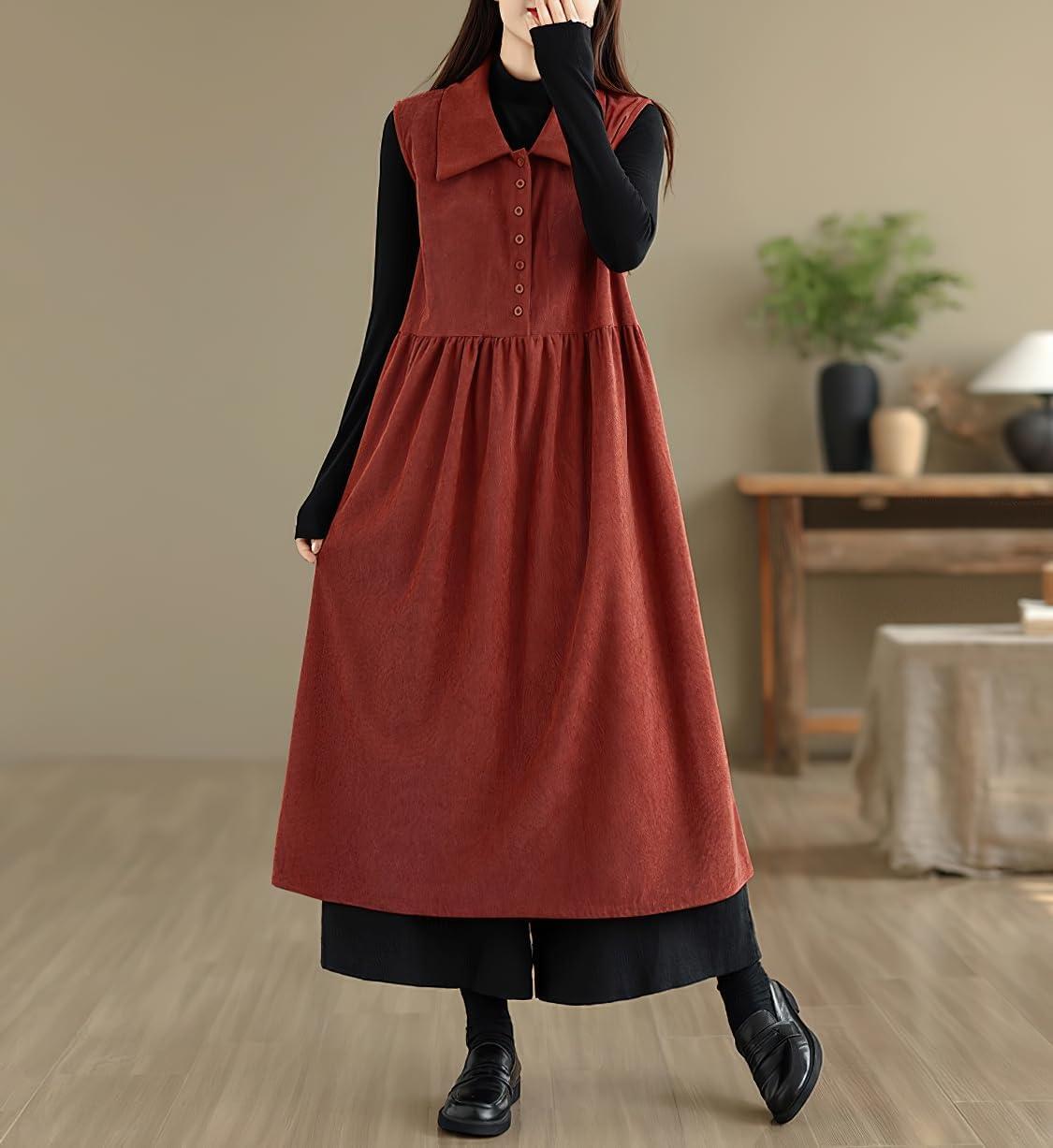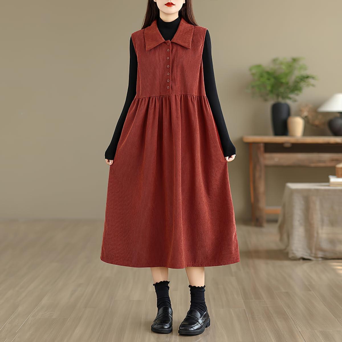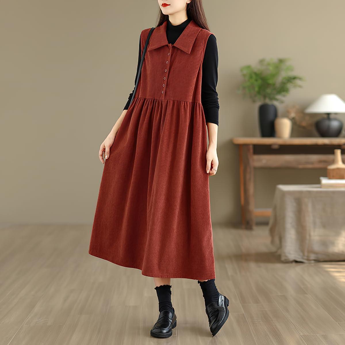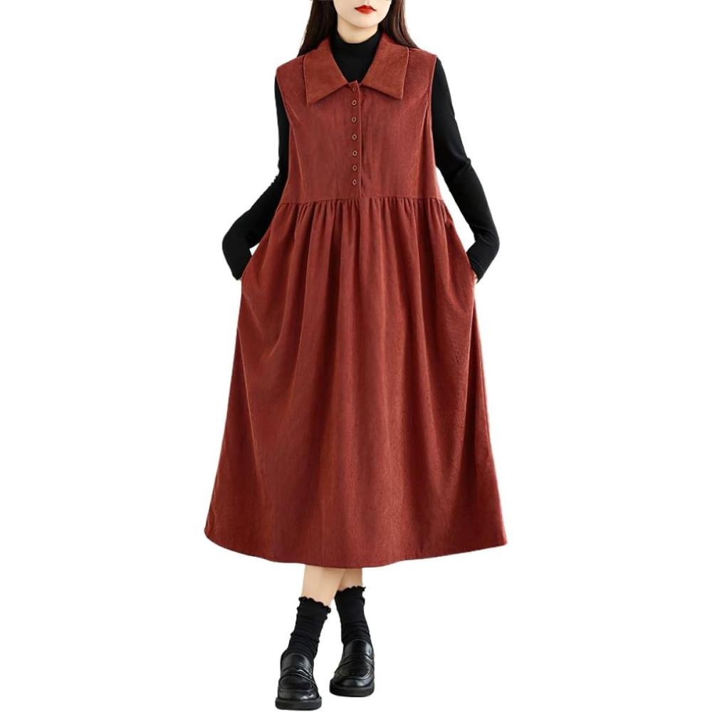 chouyatou Women’s Babydoll Corduroy Overall Dress Lapel Button Front Ruffle Long Pinafore Jumper Dress(Red)
