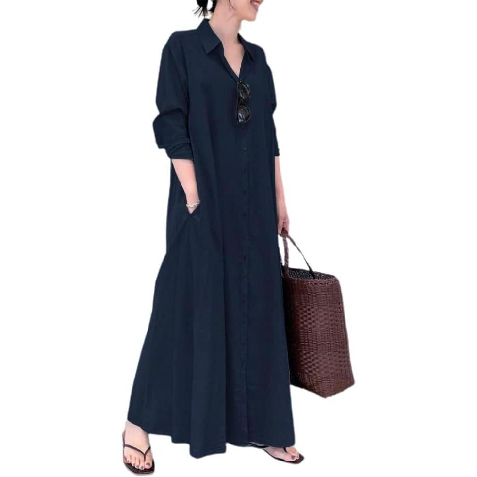 chouyatou Women’s Basic Loose Fit Long Sleeve Button Up Maxi Shirt Dress with Pockets(Navy Blue)