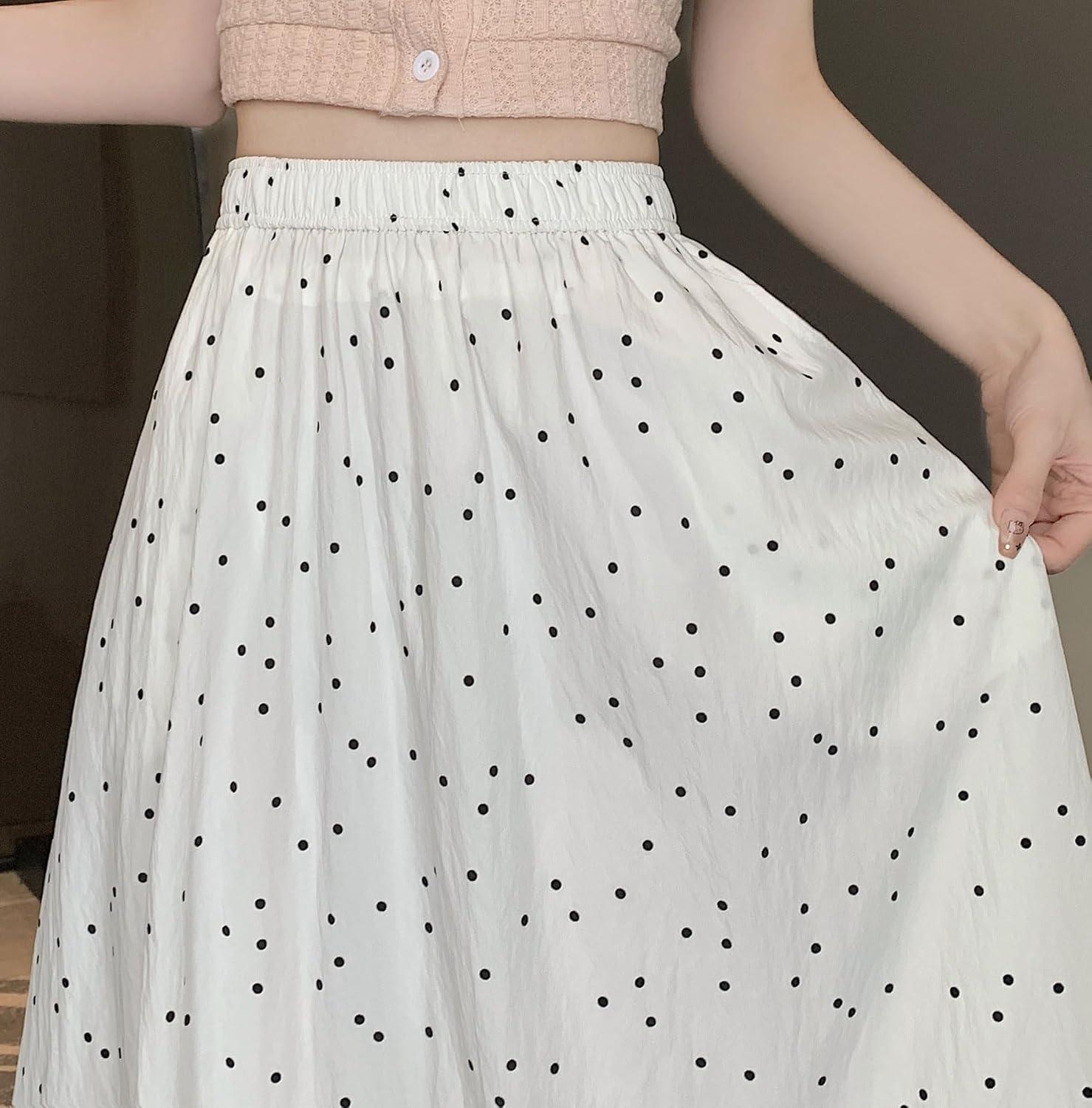 chouyatou Women's Boho Ditsy Polka Dot A-Line Skirt Elastic Waist Swing Pleated Midi Long Skirt with Pockets(White)