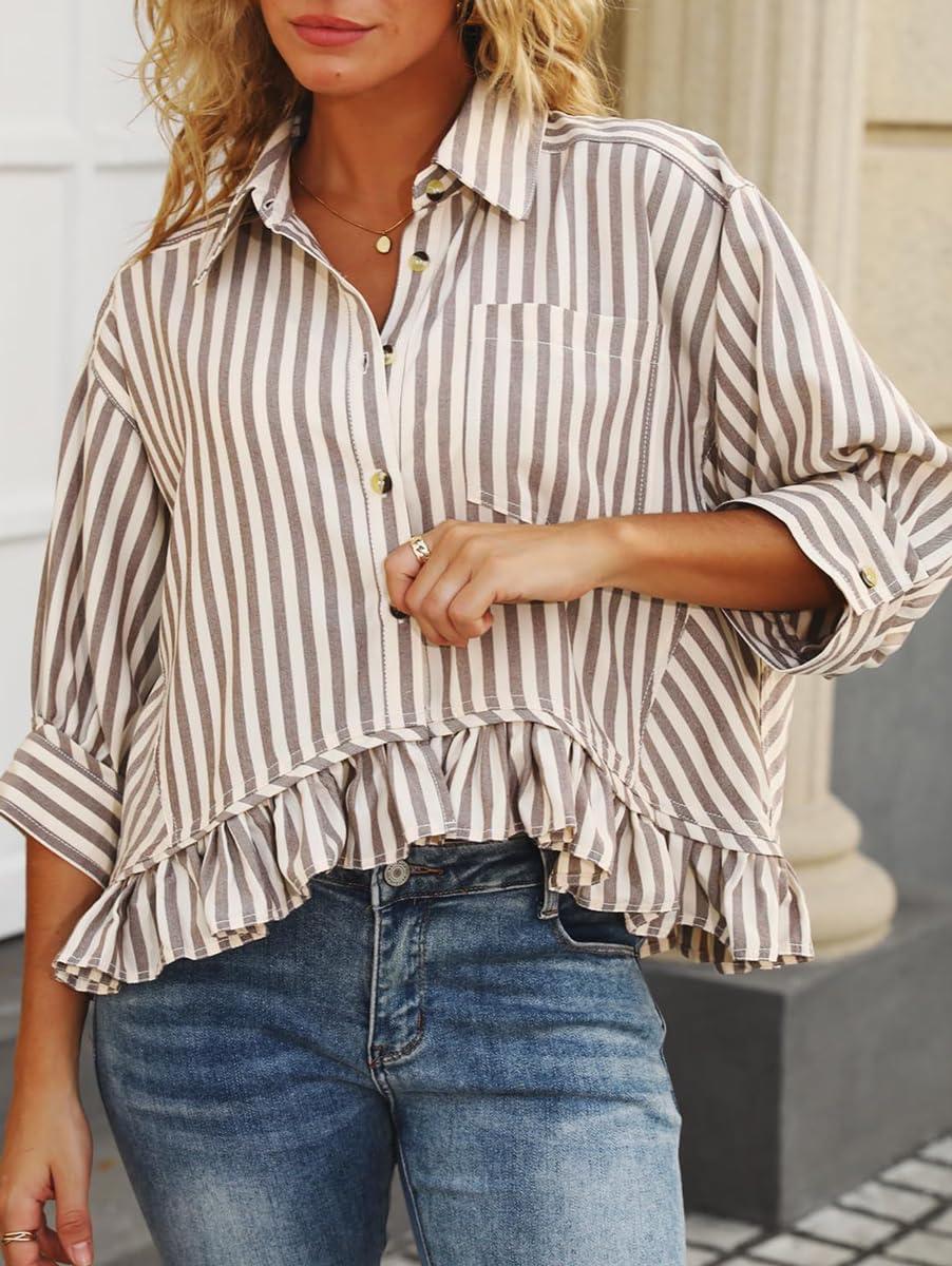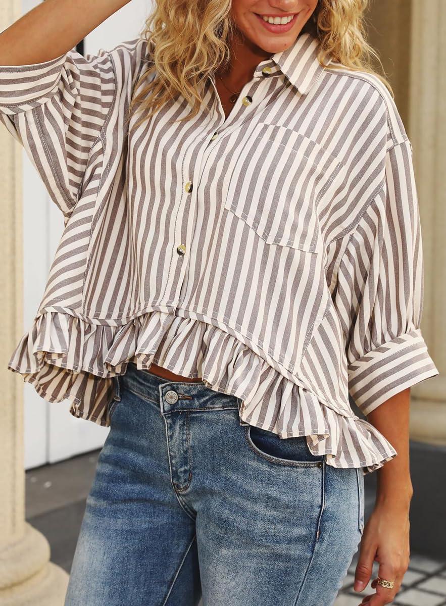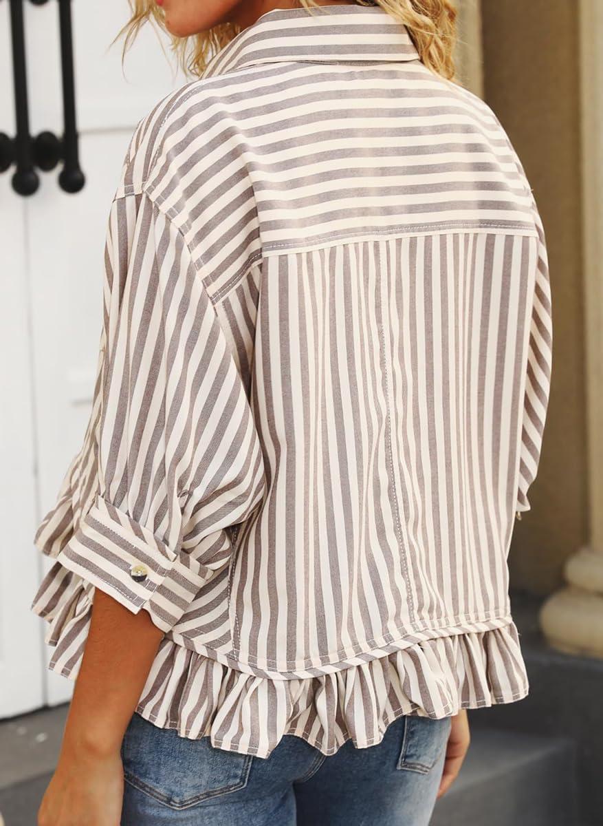 CHOUYATOU Women’s Business Casual Striped Button Down Shirt Loose 3/4 Sleeve Peplum Tops Work Blouses(Khaki)
