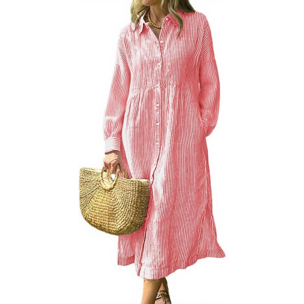 CHOUYATOU Women’s Business Casual Striped Shirt Dress Long Sleeve Button Down Midi Long Boho Dress(Red)