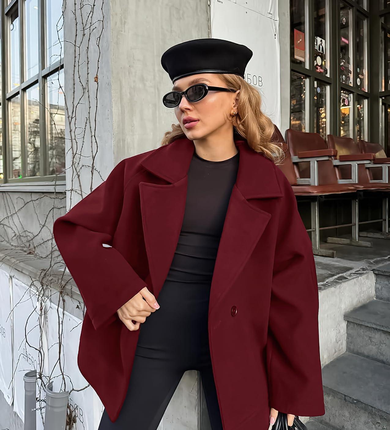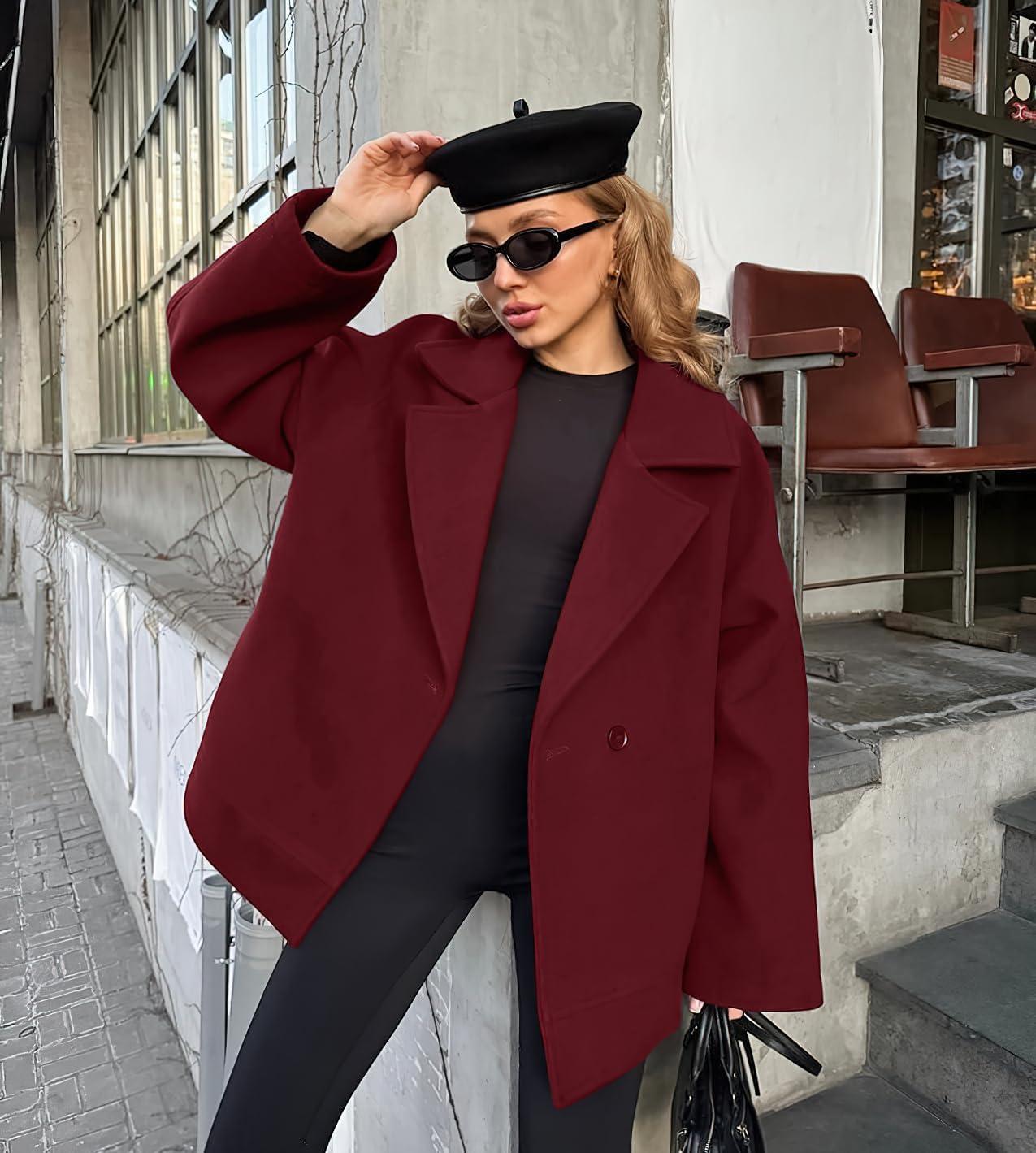 chouyatou Women’s Business Casual Wool Coat Suit Top Loose Dressy Blazer Jacket Trench Coat with Belt(Red)