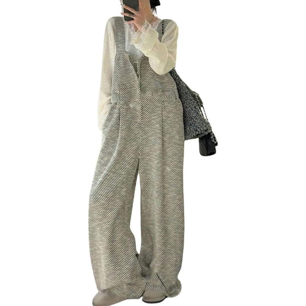 chouyatou Women’s Casual Adjustable Strap Striped Overall Sleeveless Loose Baggy One Piece Jumpsuit Long Pants(Black)
