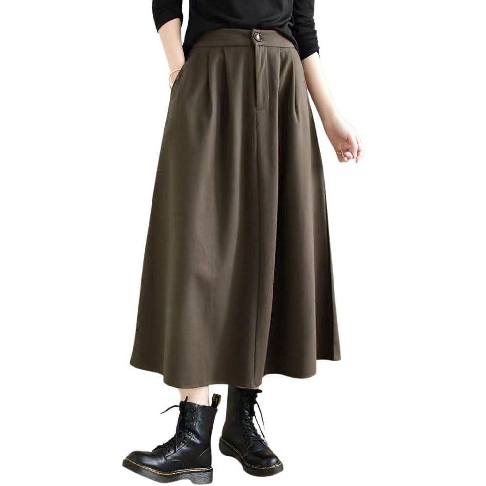 chouyatou Women’s Casual High Elastic Waist Wool Skirt A-Line Pleated Swing Wool Midi Long Skirt with Pockets(Coffee)