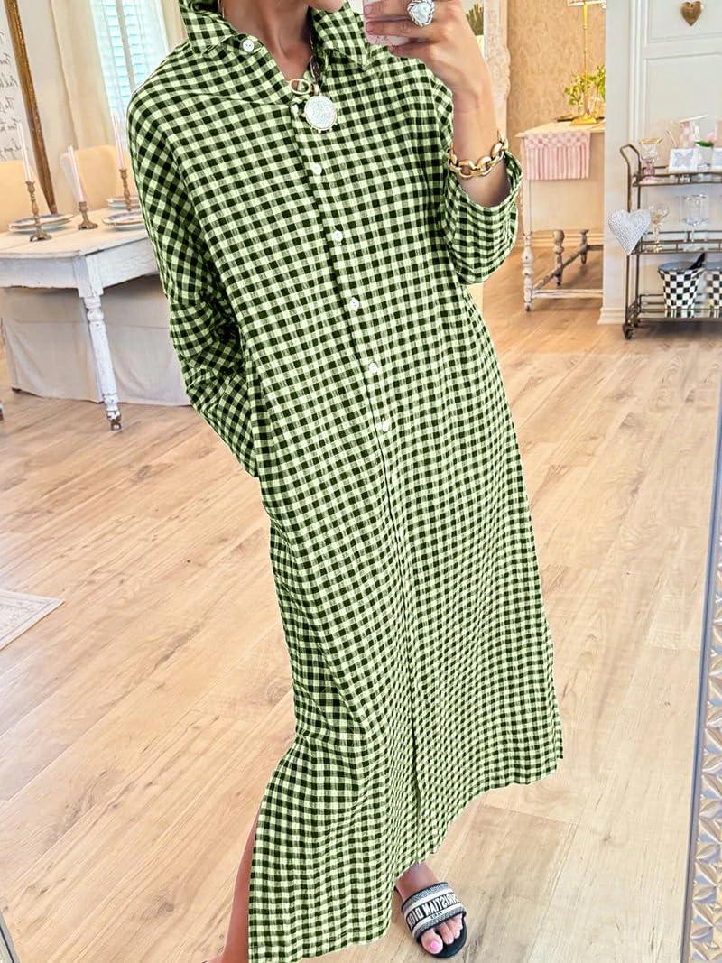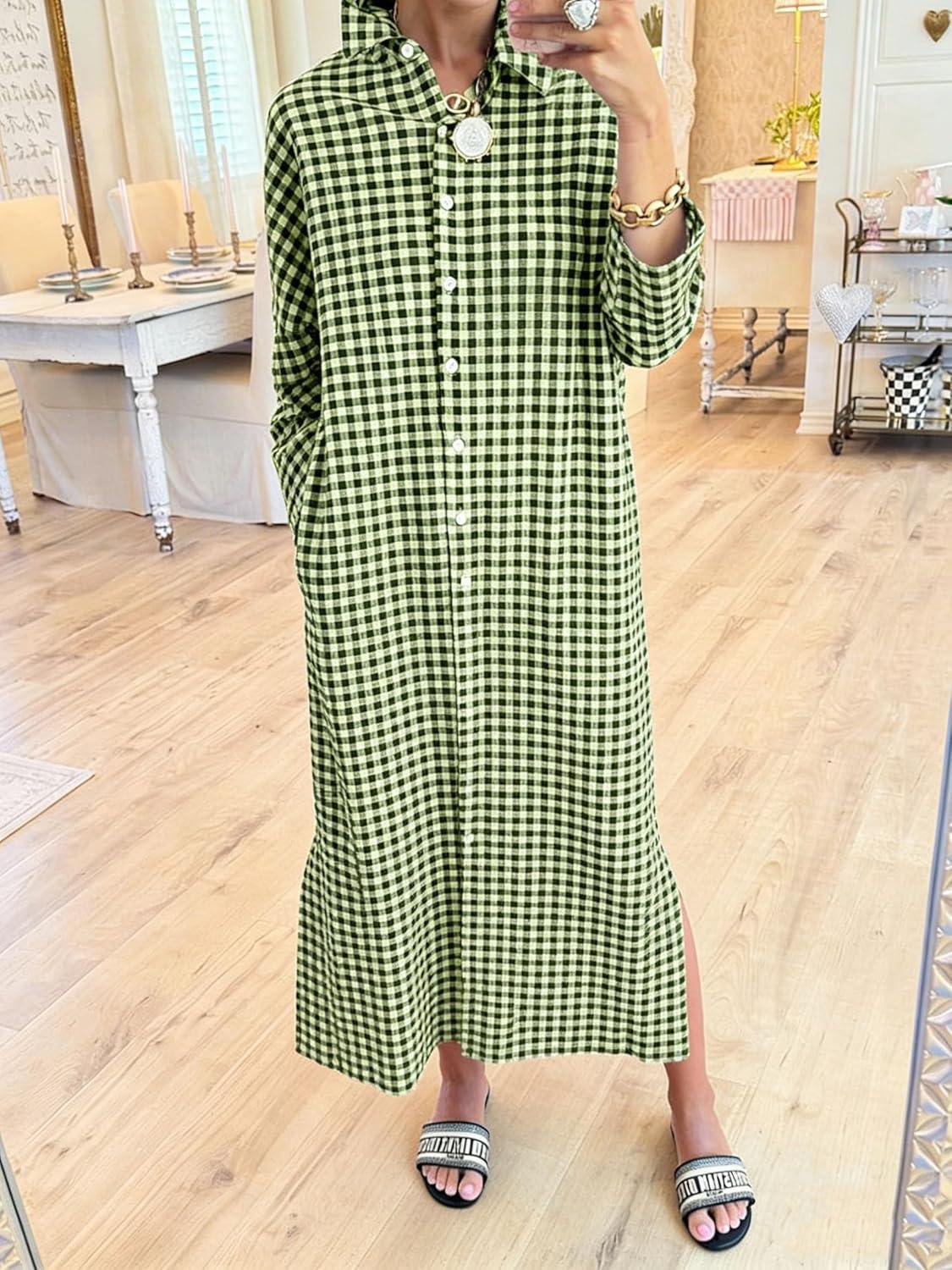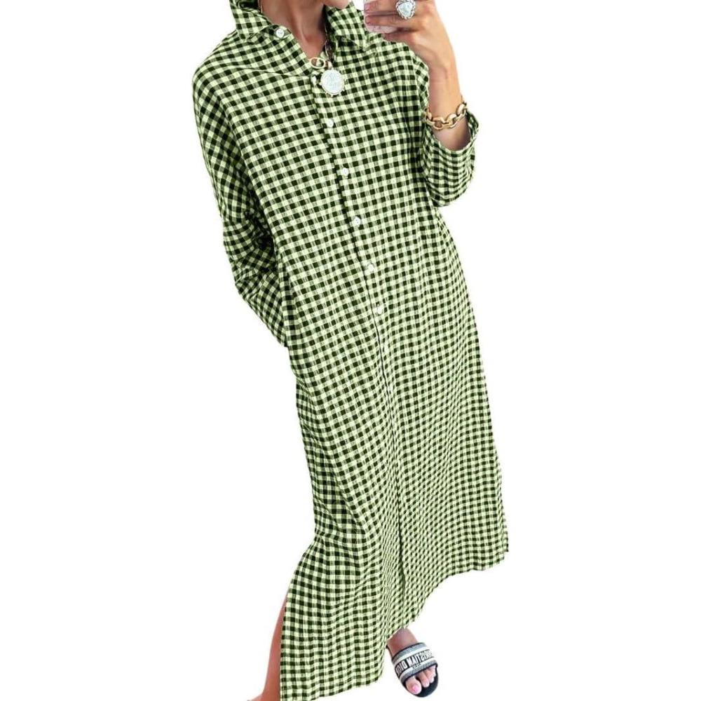 chouyatou Women’s Casual Loose Button Down Plaid Shirt Dress Long Sleeve Side Slit Cotton Gingham Maxi Dress(Green)