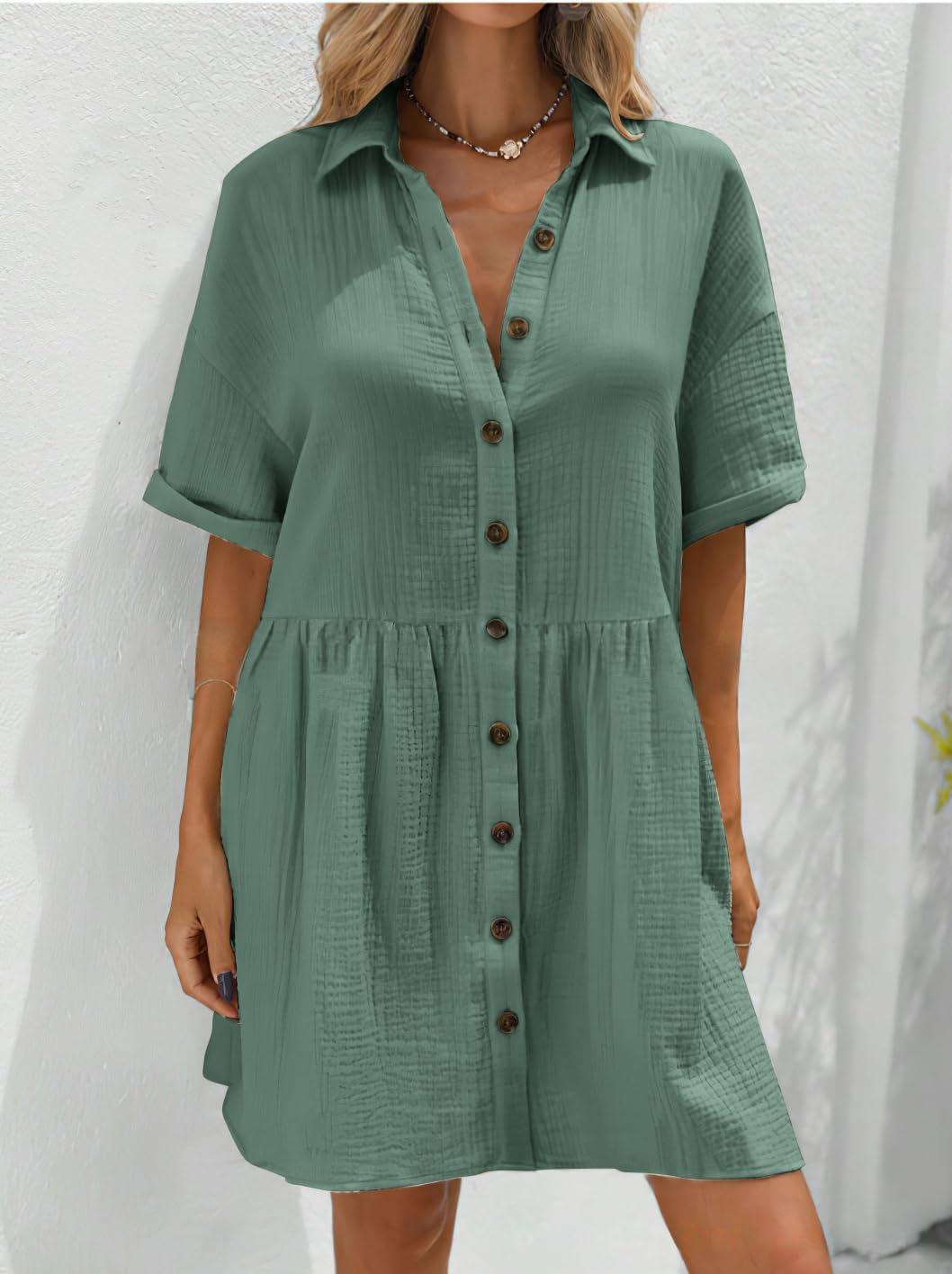 chouyatou Women’s Casual Short Sleeve Button Down Mini Shirt Dress Cotton Babydoll Tunic Loose Beach Dress(Ocean Green)