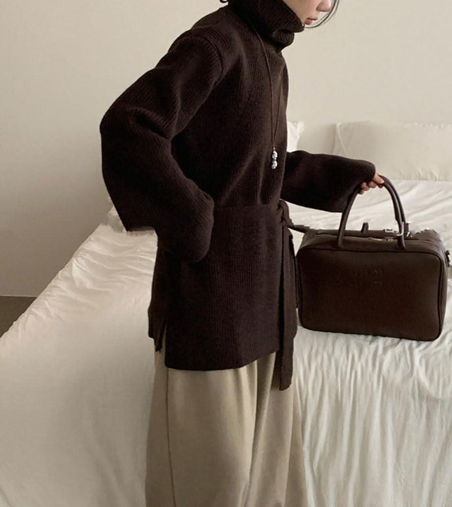 chouyatou Women’s Casual Turtleneck Belted Sweaters Ribbed Knit Slouchy Pullover Sweater Tunic Tops with Side Slit(Coffee)
