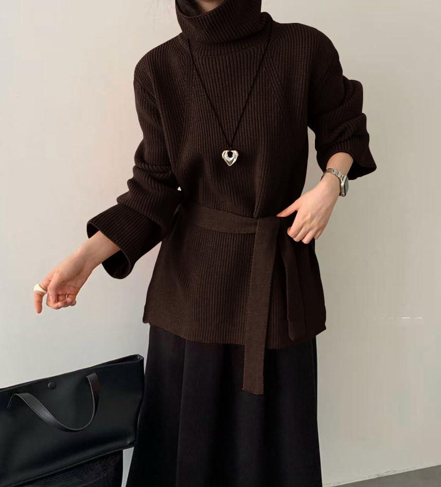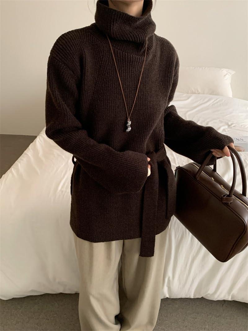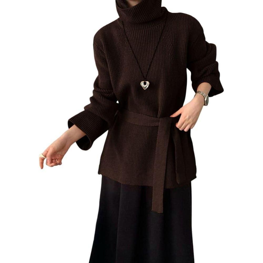 chouyatou Women's Casual Turtleneck Belted Sweaters Ribbed Knit Slouchy Pullover Sweater Tunic Tops with Side Slit(Coffee)