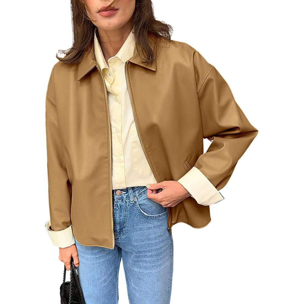 chouyatou Women’s Casual Zip Up Faux Leather Motorcycle Jacket Lapel Pu Leather Jacket Outerwear Coat with Pockets(Khaki)