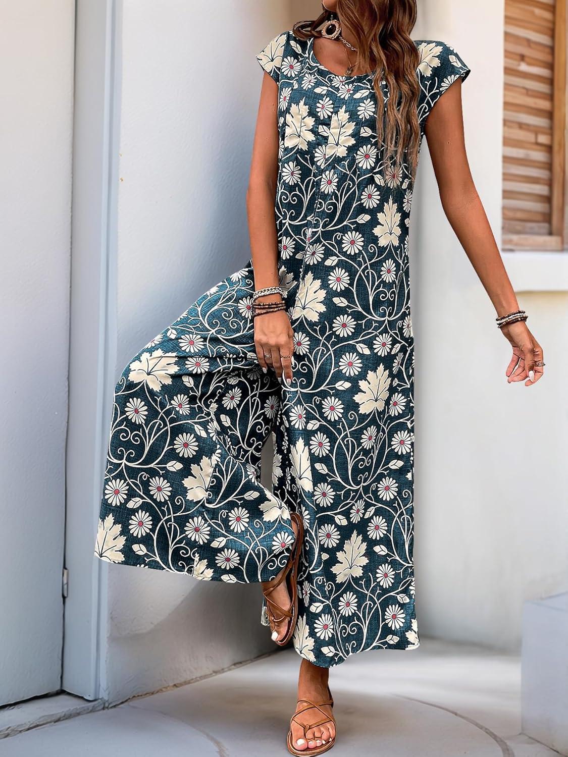 chouyatou Women’s Cute Daisy Floral Wide Leg Baggy Jumpsuit Rompers Cap Short Sleeve Loose Comfy Overalls Pants(Blue)