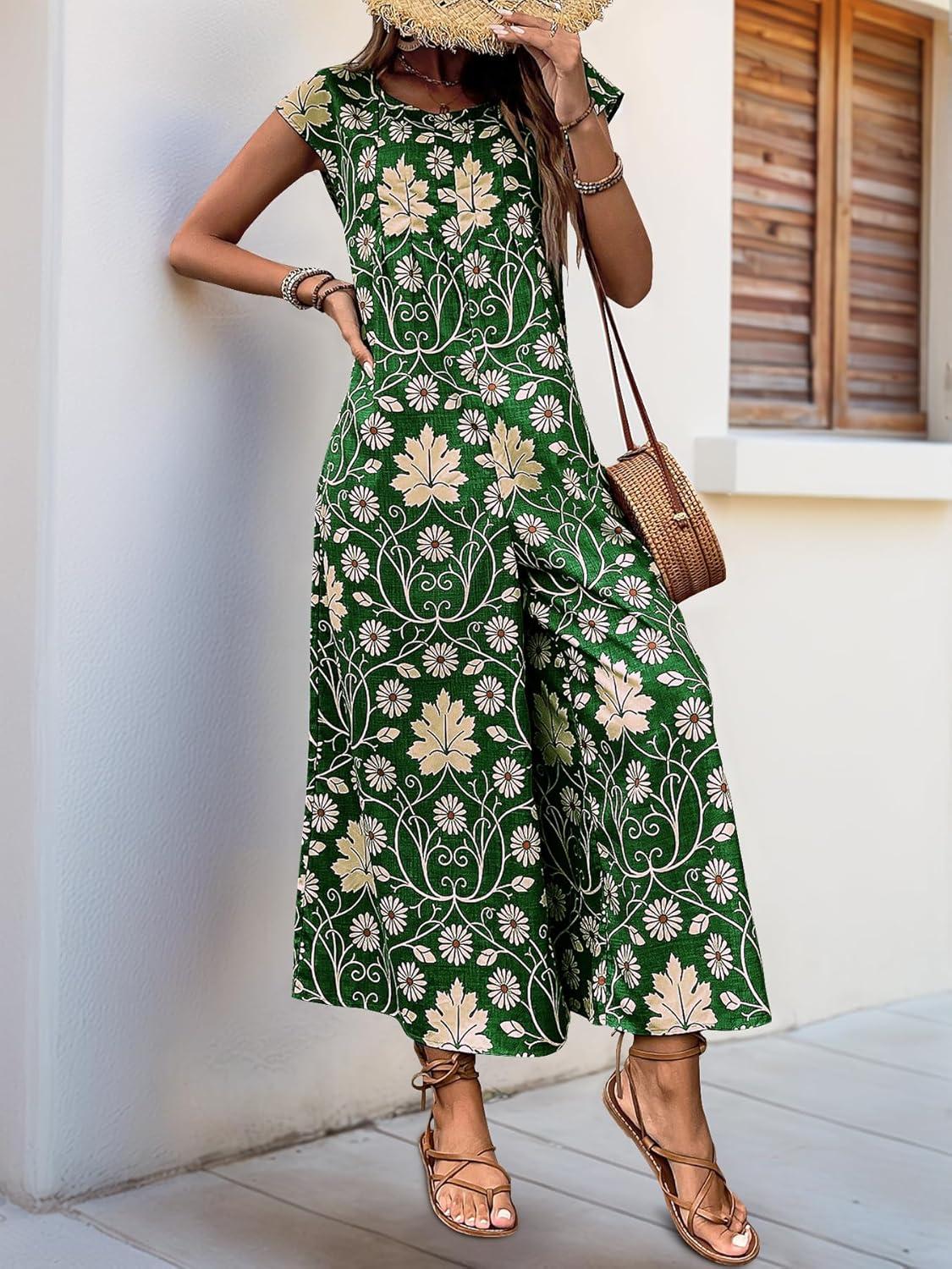 chouyatou Women’s Cute Daisy Floral Wide Leg Baggy Jumpsuit Rompers Cap Short Sleeve Loose Comfy Overalls Pants(Green)