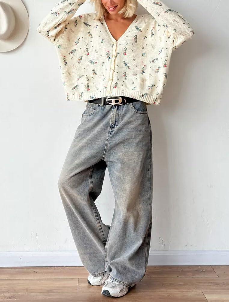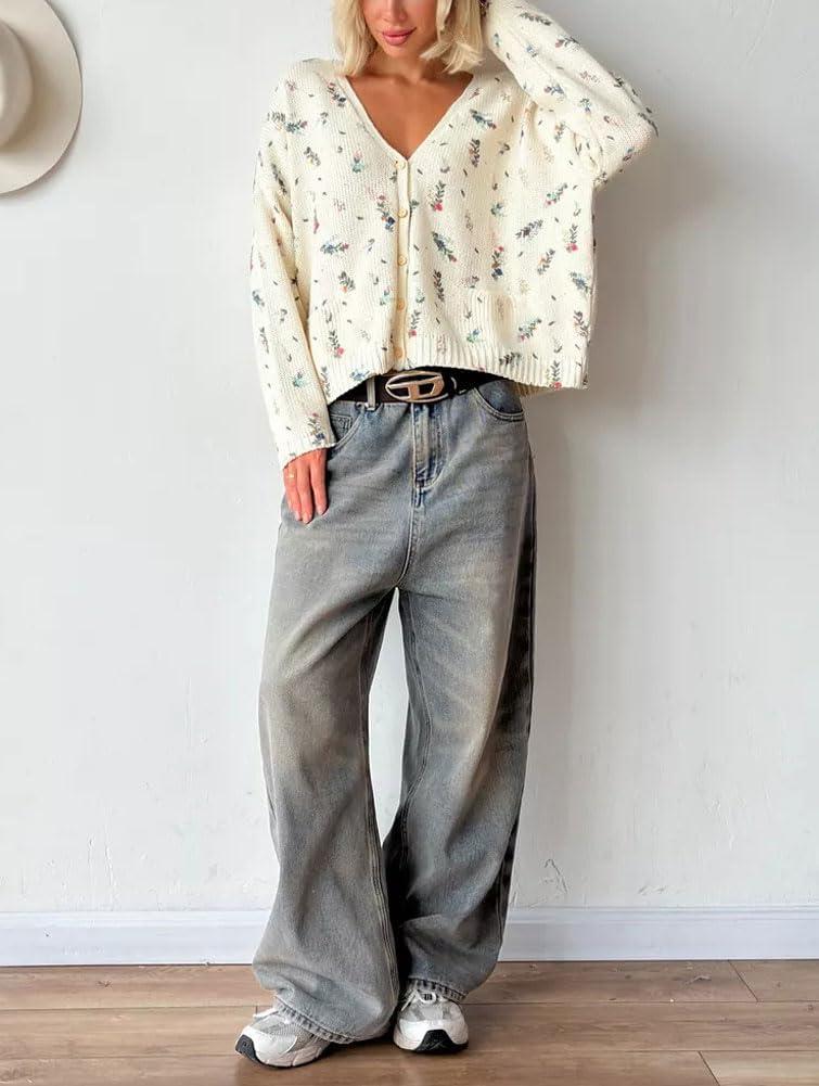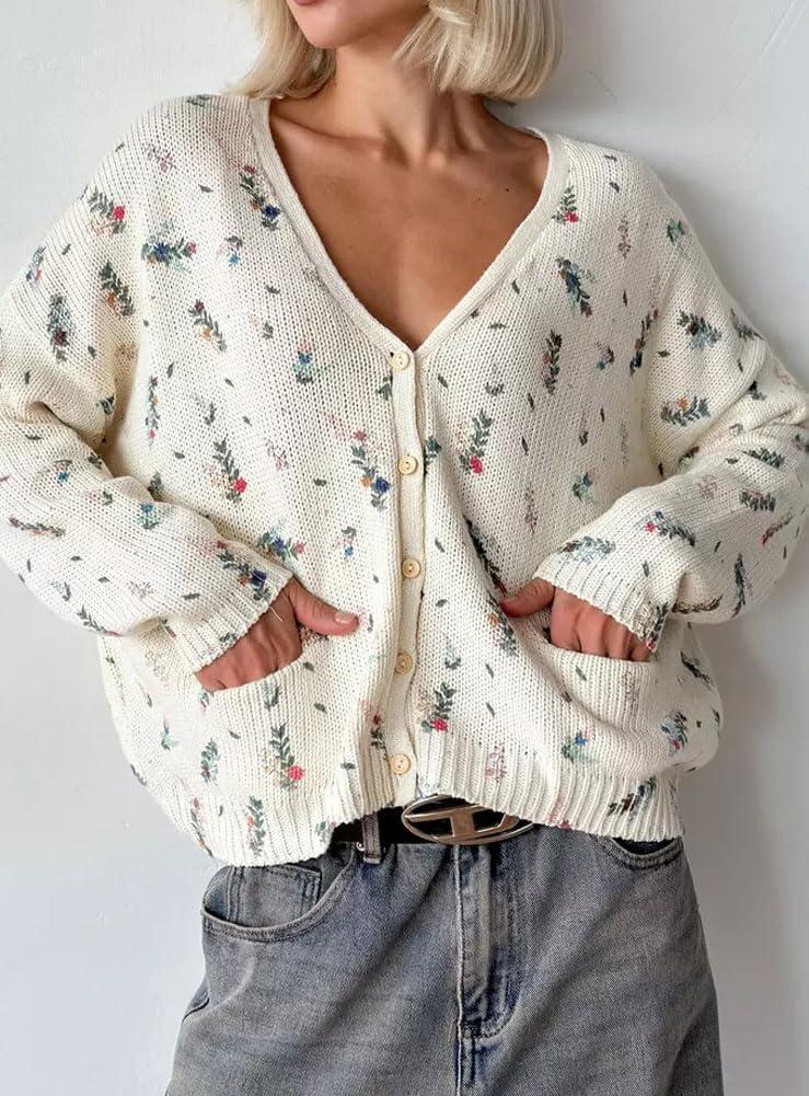 chouyatou Women's Cute Ditsy Floral Embroidered Cardigan Sweater V-Neck Button Down Knit Jacket Tops(Beige)