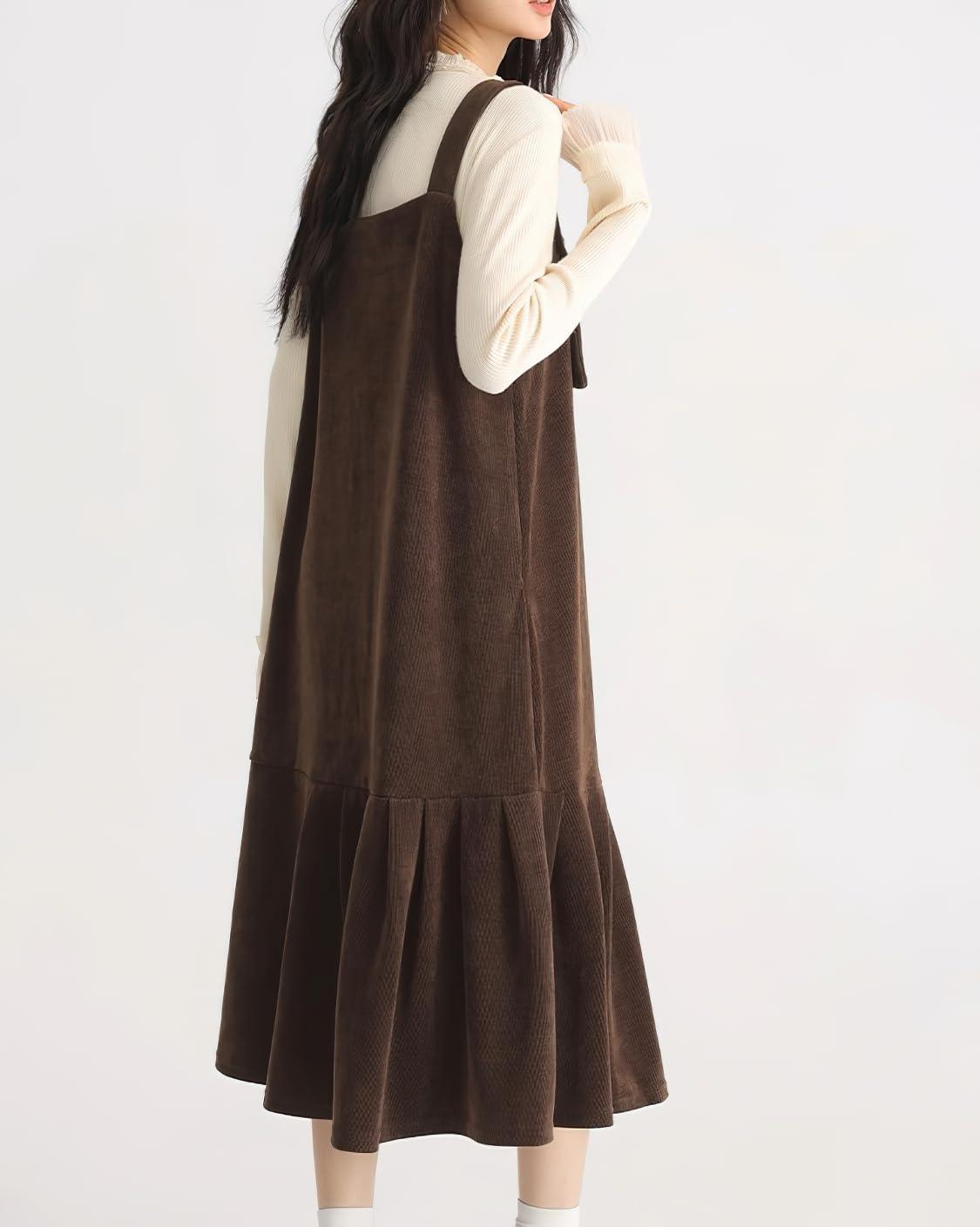 chouyatou Women's Cute Ruffle Corduroy Pinafore Overall Dress Pleated Flared Mid Long Bib Jumper Dress(Dark Brown)