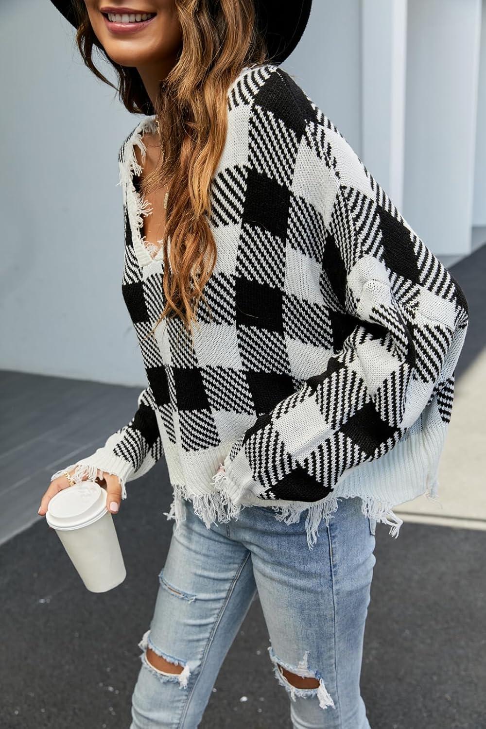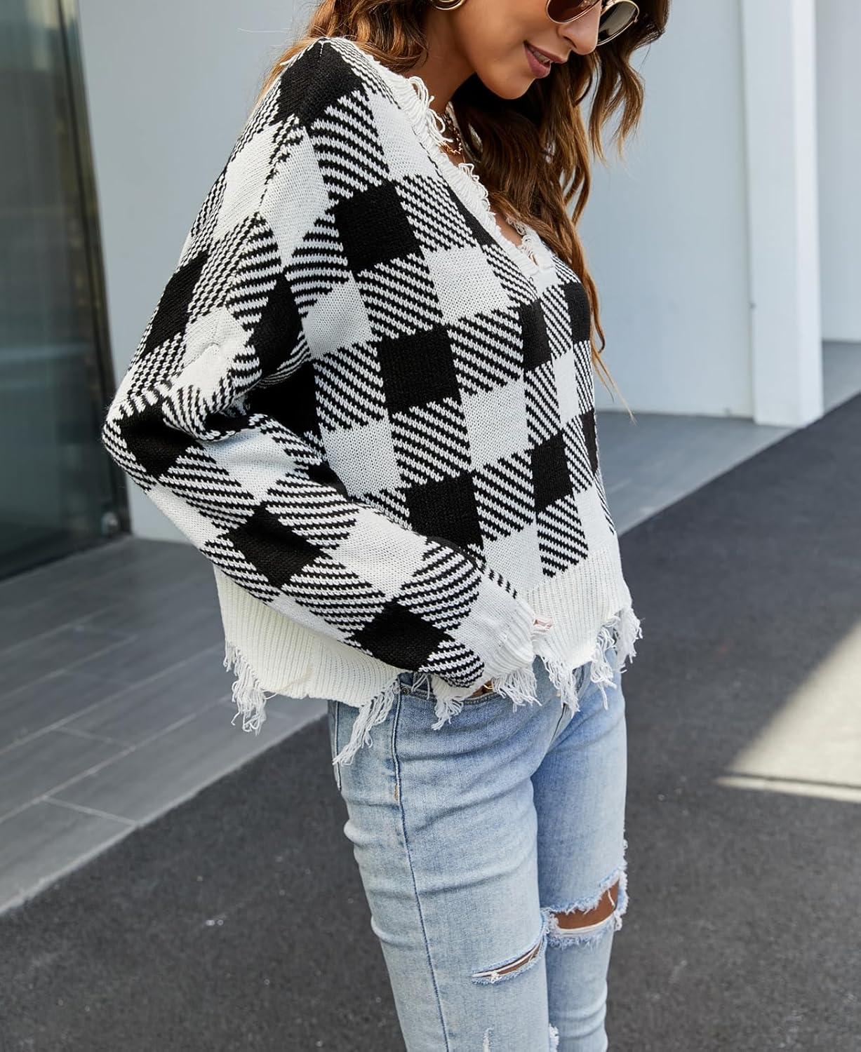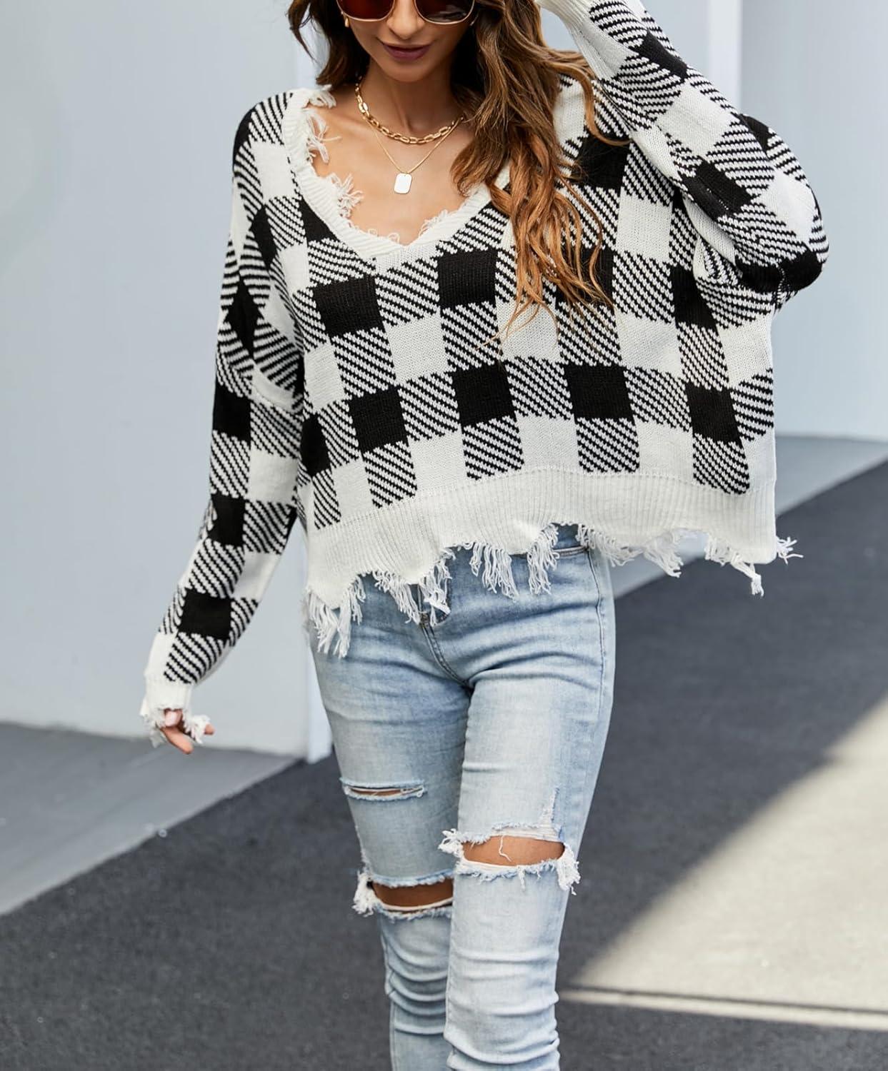 chouyatou Women’s Cute Y2k Ripped Sweater Frayed V-Neck Loose-Fit Floral Knitted Pullover Crop Top(Checked Black)