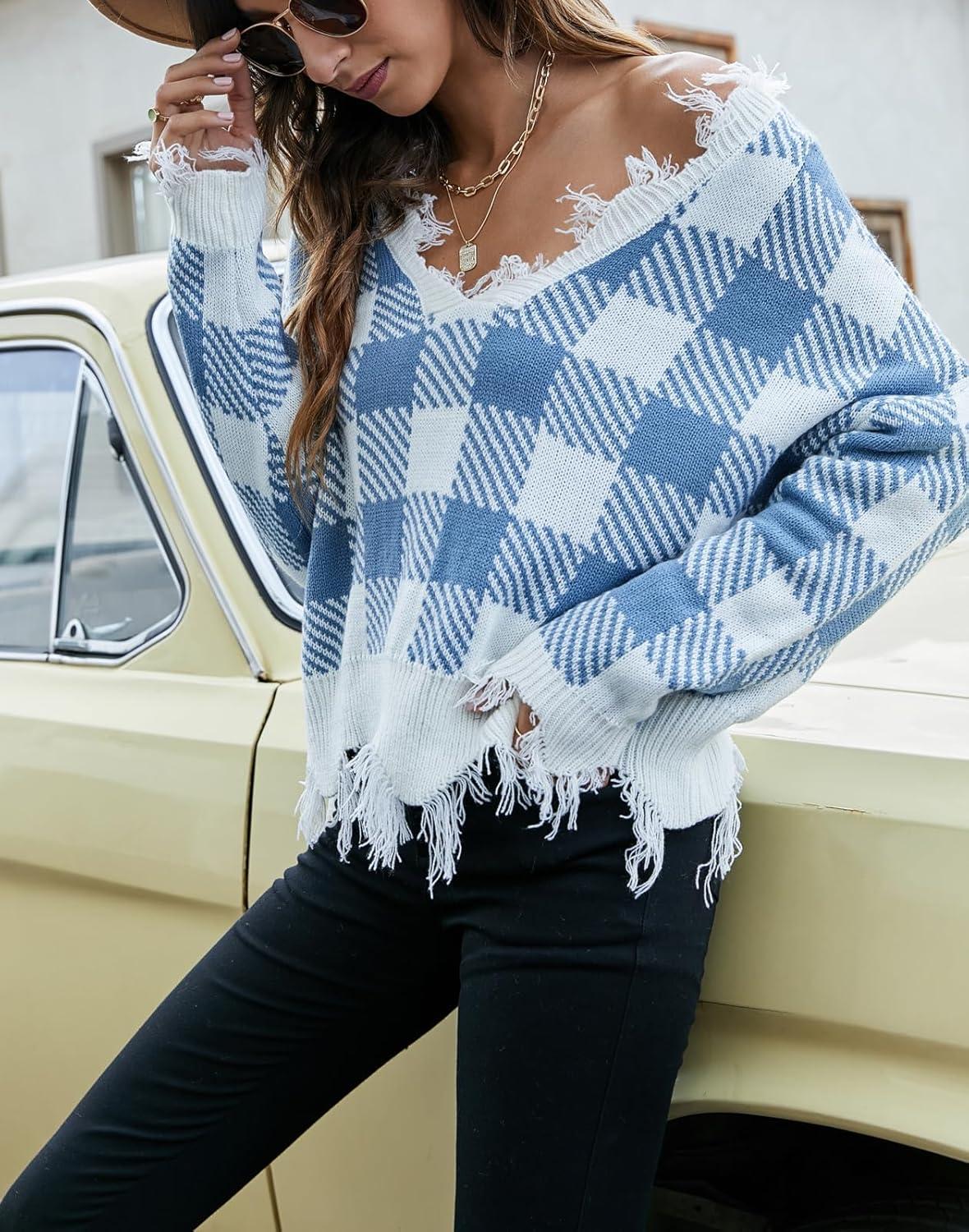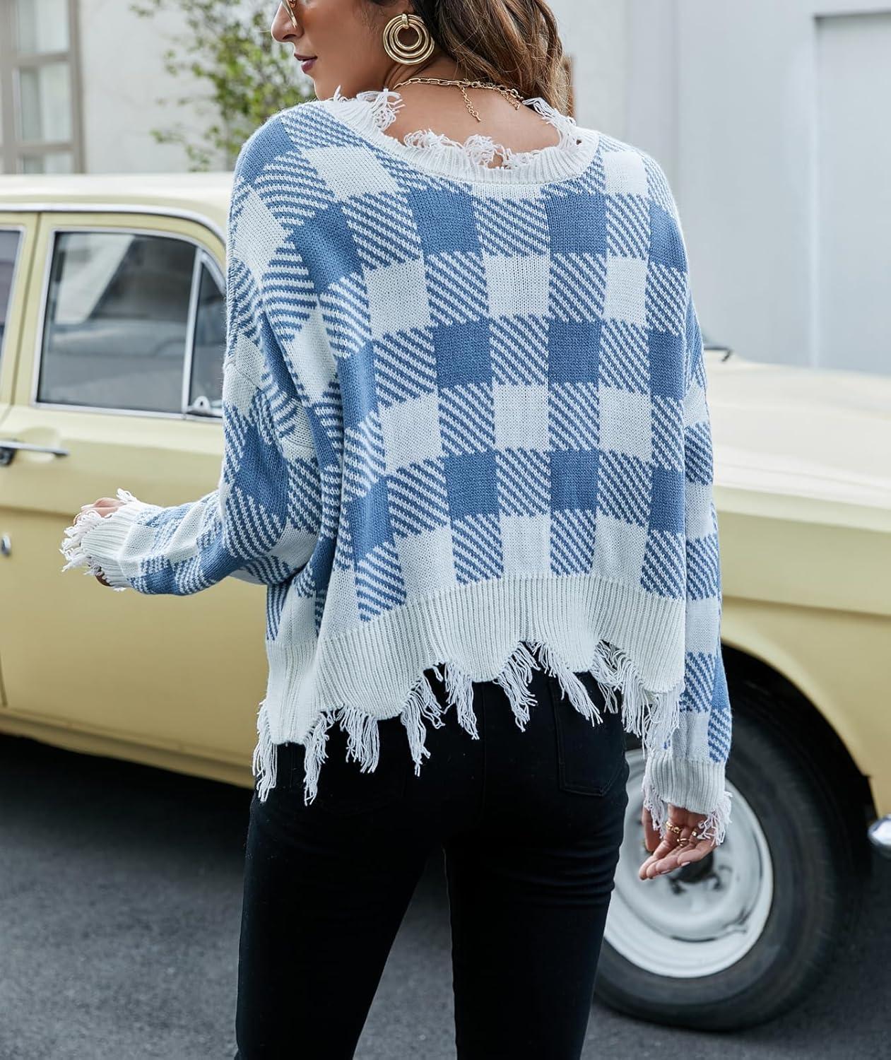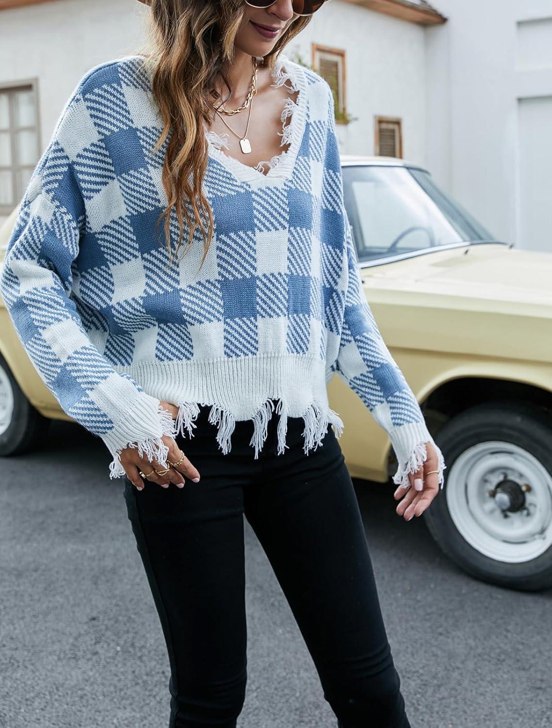Be the first to review “chouyatou Women’s Cute Y2k Ripped Sweater Frayed V-Neck Loose-Fit Floral Knitted Pullover Crop Top(Checked Blue)”